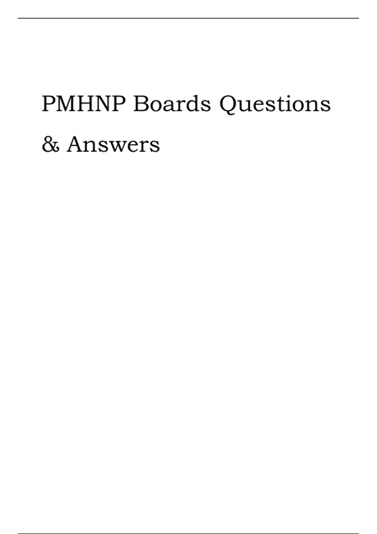 PMHNP Boards Questions & AnswersA 14-year-old patient has nonspecific complaints about pain in his or her legs. The physical examination is unremarkable. Laboratory results are within normal limits except for a markedly elevated alkaline phosphatase level. The psychiatricmental health nurse practitioner - ANSWER-interprets the findings as normally occurring during a rapid adolescent growth spurt Laboratory findings for a patient with an alcohol use disorder indicate increased liver function values and: - ANSWER-increased MCV and elevated triglyceride levels. A new patient arrives at the office for treatment for depression. The patient reports taking simvastatin (Zocor) and lisinopril (Zestril). When selecting an antidepressant, the psychiatric-mental health nurse practitioner eliminates fluoxetine (Prozac), based on the knowledge that the combination can lead to increased plasma levels of the statin, resulting in an increased risk of muscle damage and rhabdomyolysis. The nurse practitioner's reason is that: - ANSWER-one medication is a CYP450 3A4 substrate and one is a CYP450 3A4 inhibitor. A 28-year-old patient who is psychotic arrives at the clinic with family members but refuses to meet if the family members are present. The psychiatric-mental health nurse practitioner - ANSWER-asks the family members to leave for the appointment