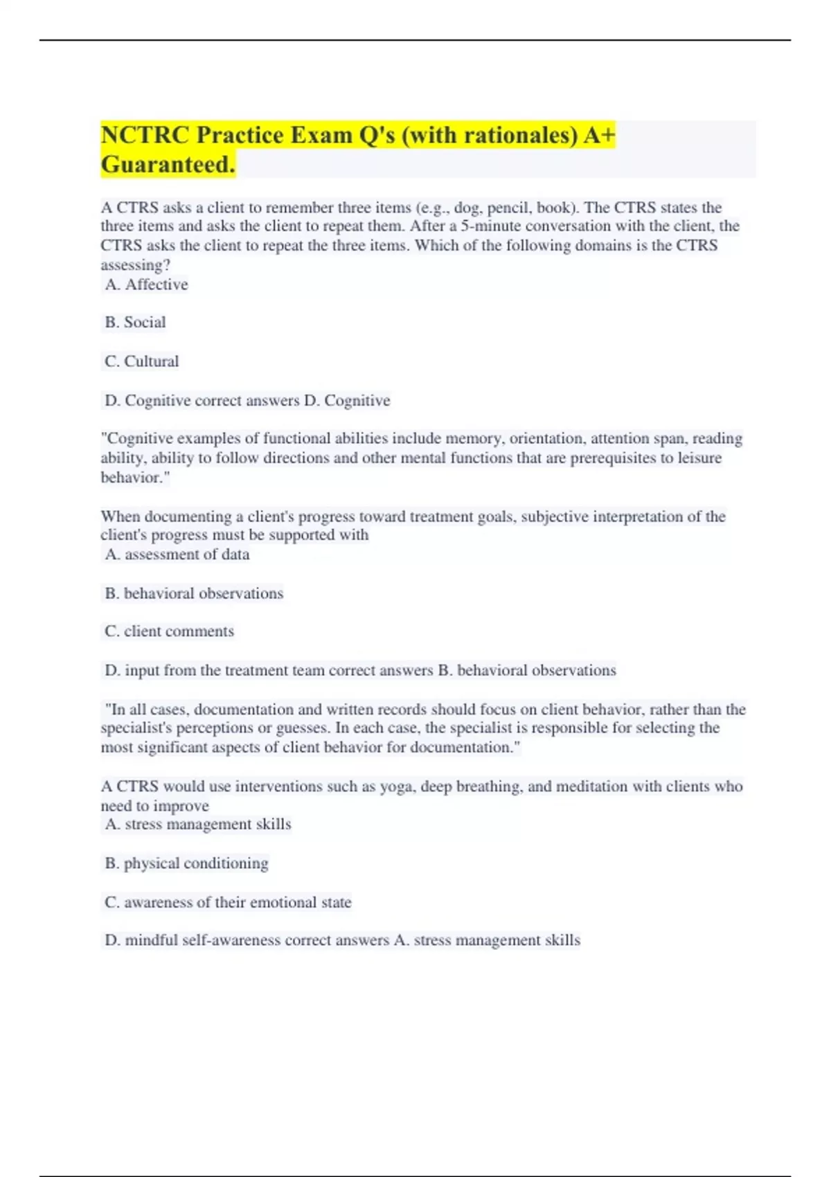 A CTRS asks a client to remember three items (e.g., dog, pencil, book). The CTRS states the three items and asks the client to repeat them. After a 5-minute conversation with the client, the CTRS asks the client to repeat the three items. Which of the following domains is the CTRS assessing? A. Affective B. Social C. Cultural D. Cognitive correct answers D. Cognitive "Cognitive examples of functional abilities include memory, orientation, attention span, reading ability, ability to follow directions and other mental functions that are prerequisites to leisure behavior." When documenting a client's progress toward treatment goals, subjective interpretation of the client's progress must be supported with A. assessment of data B. behavioral observations C. client comments D. input from the treatment team correct answers B. behavioral observations "In all cases, documentation and written records should focus on client behavior, rather than the specialist's perceptions or guesses. In each case, the specialist is responsible for selecting the most significant aspects of client behavior for documentation." A CTRS would use interventions such as yoga, deep breathing, and meditation with clients who need to improve A. stress management skills B. physical conditioning C. awareness of their emotional state D. mindful self-awareness correct answers A. stress managem