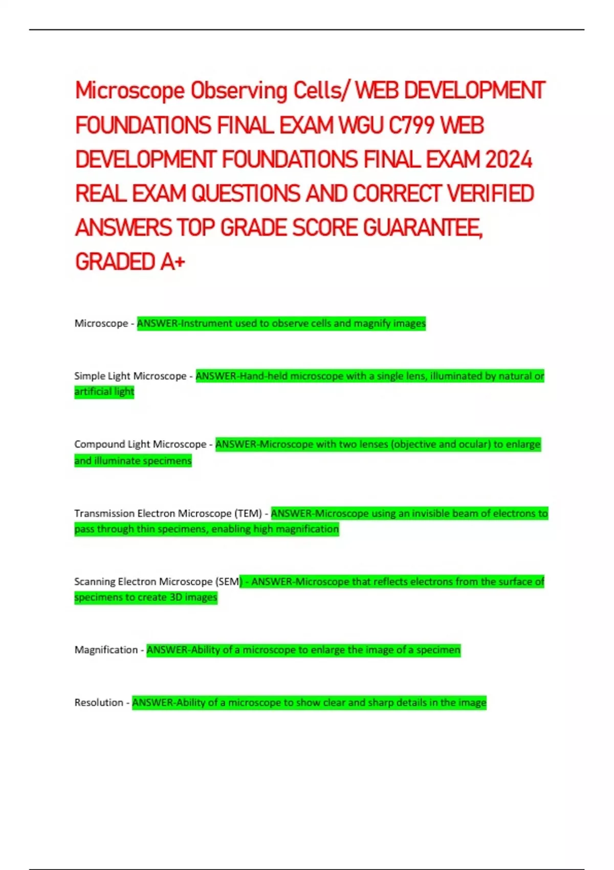 Microscope Observing Cells/ WEB DEVELOPMENT FOUNDATIONS FINAL EXAM WGU C799 WEB DEVELOPMENT FOUNDATIONS FINAL EXAM 2024 REAL EXAM QUESTIONS AND CORRECT VERIFIED ANSWERS TOP GRADE SCORE GUARANTEE, GRADED A+