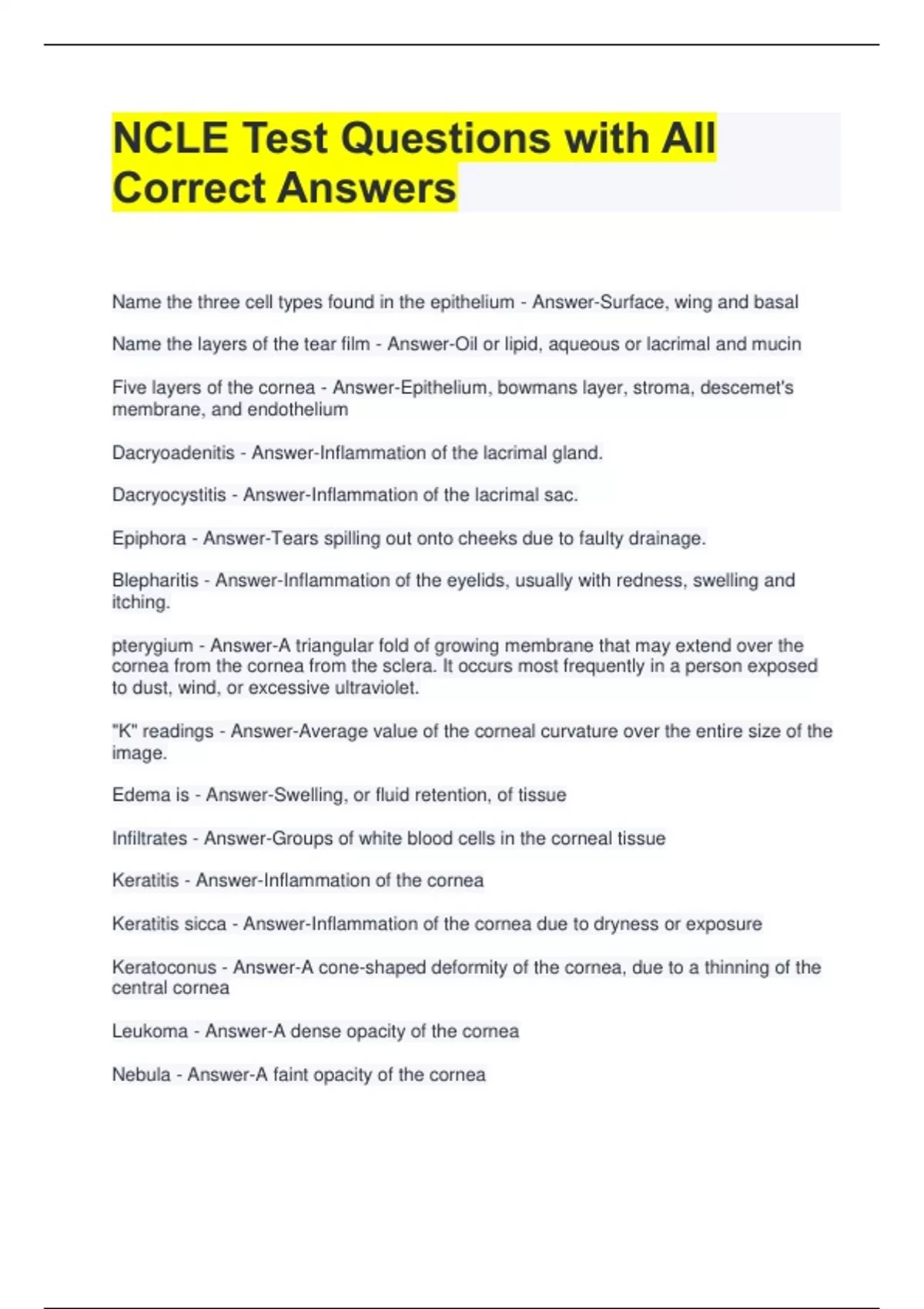 NCLE Test Questions with All Correct Answers Name the three cell types found in the epithelium - Answer-Surface, wing and basal Name the layers of the tear film - Answer-Oil or lipid, aqueous or lacrimal and mucin Five layers of the cornea - Answer-Epithelium, bowmans layer, stroma, descemet's membrane, and endothelium Dacryoadenitis - Answer-Inflammation of the lacrimal gland. Dacryocystitis - Answer-Inflammation of the lacrimal sac. Epiphora - Answer-Tears spilling out onto cheeks due to faulty drainage. Blepharitis - Answer-Inflammation of the eyelids, usually with redness, swelling and itching. pterygium - Answer-A triangular fold of growing membrane that may extend over the cornea from the cornea from the sclera. It occurs most frequently in a person exposed to dust, wind, or excessive ultraviolet.