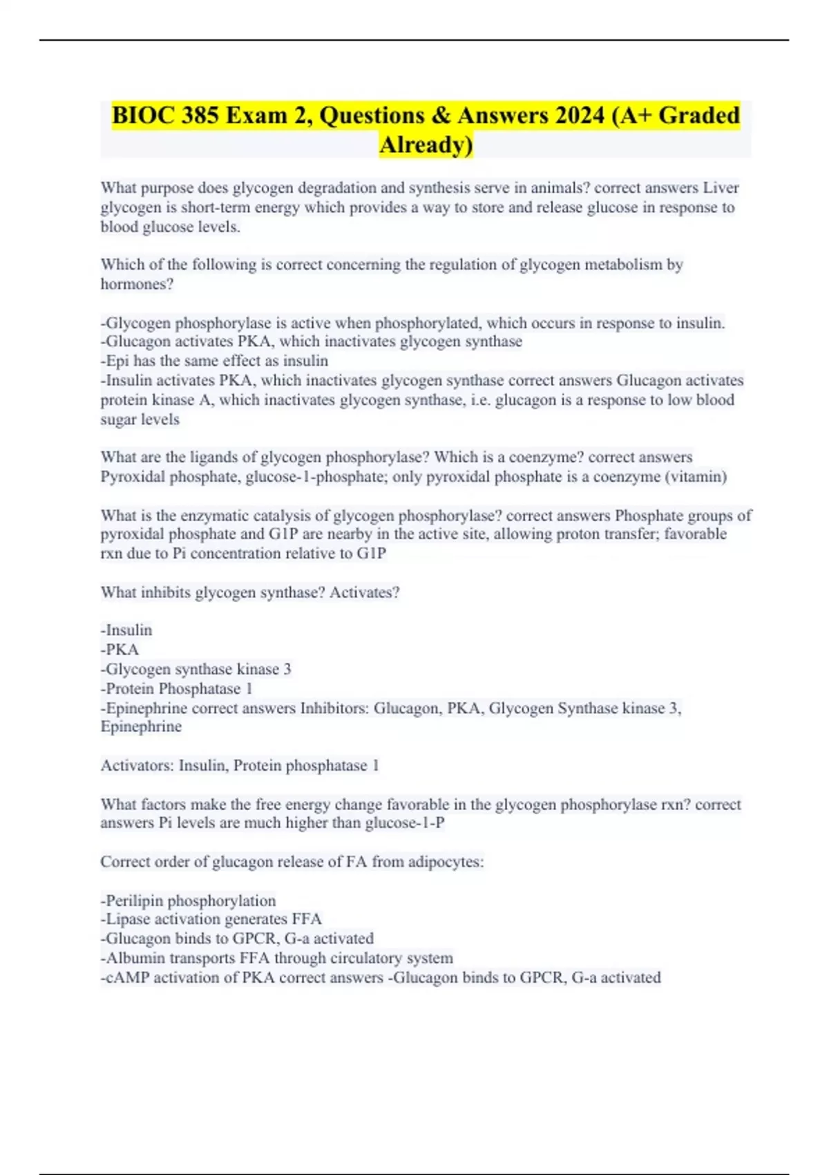 bioc 385 exam 2 questions answers 2024 a grad