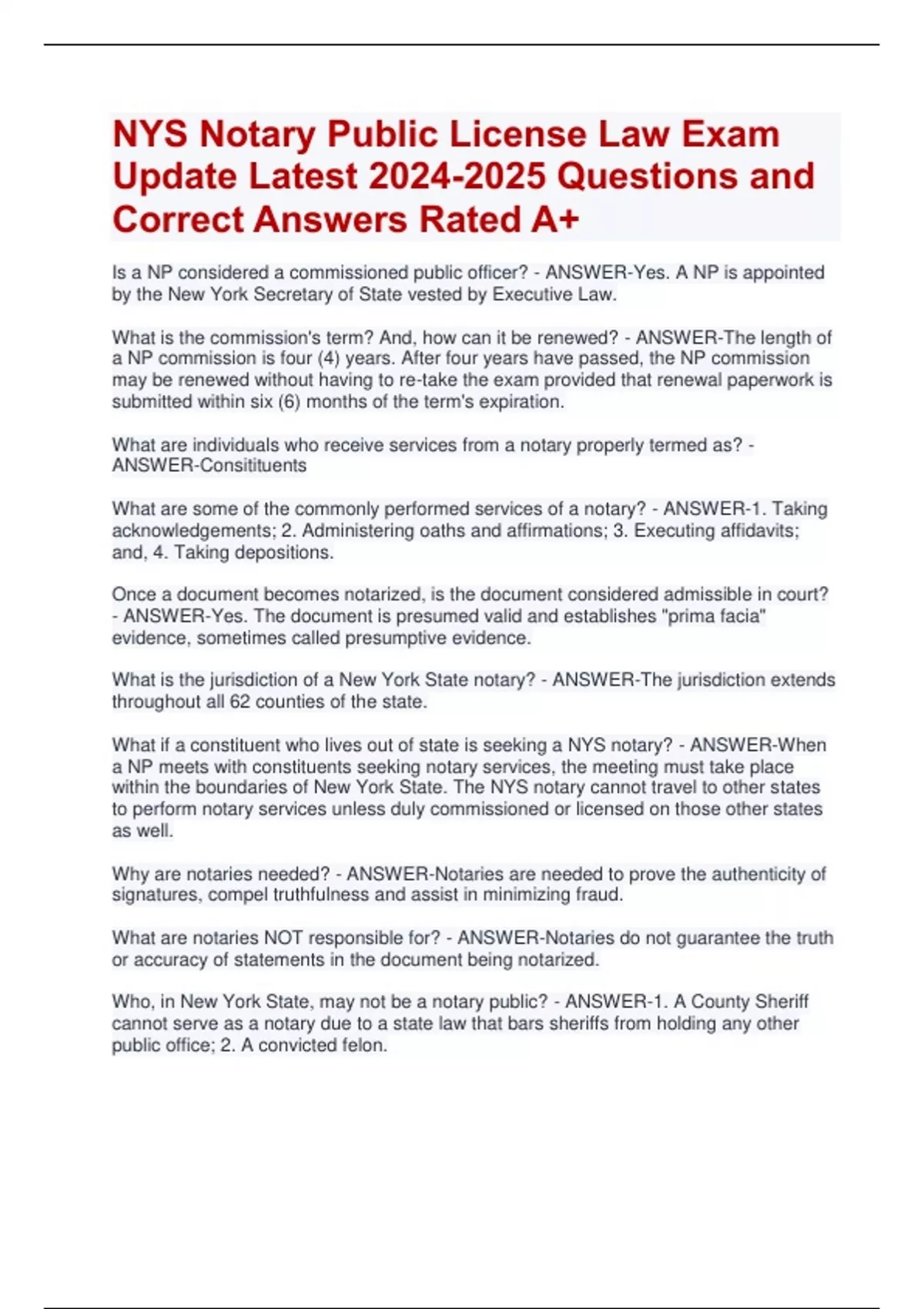 NYS Notary Public License Law Exam Update Latest Questions and Correct Answers Rated A+
