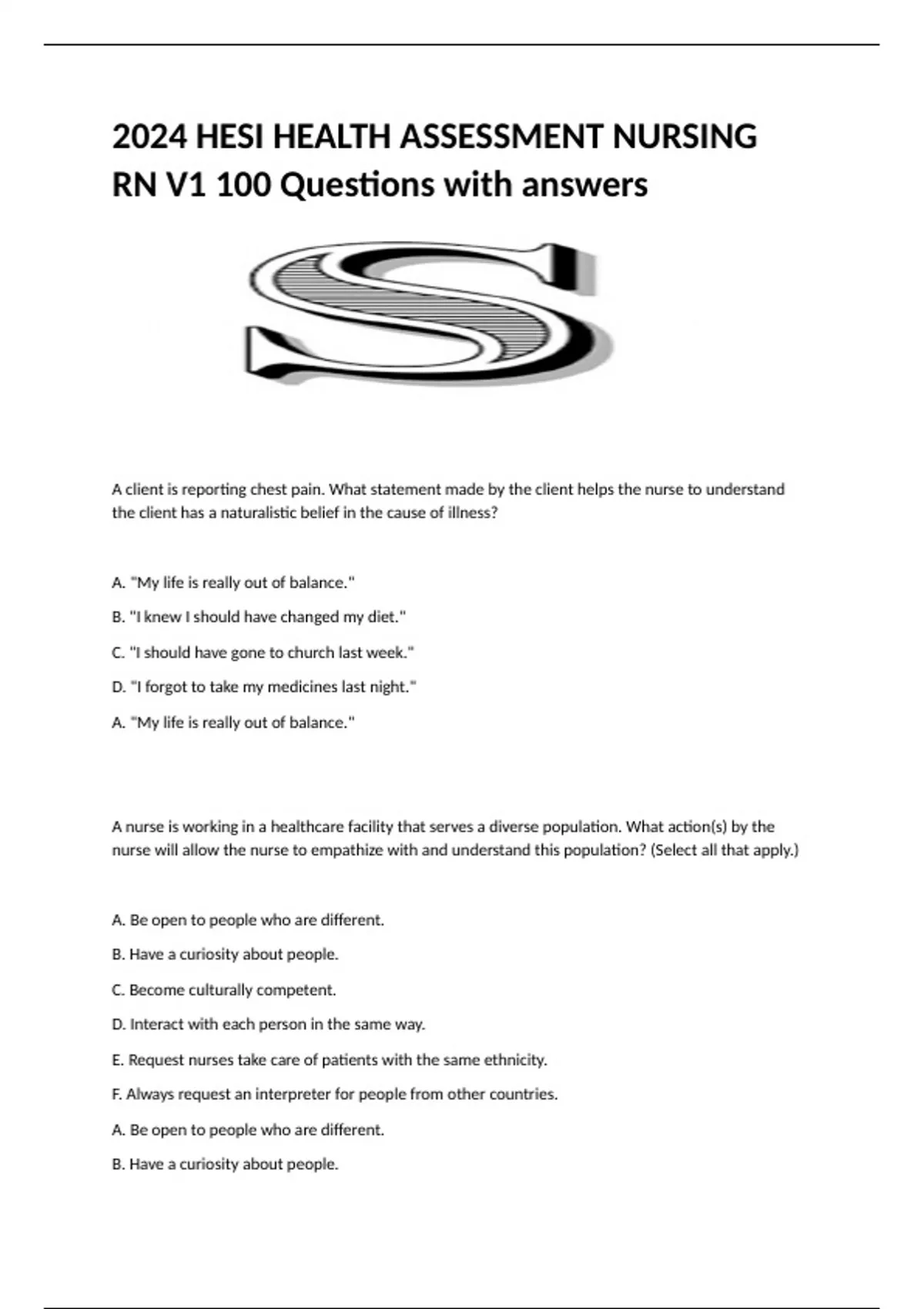 2024 HESI HEALTH ASSESSMENT NURSING RN V1 100 Questions with answers A client is reporting chest pain. What statement made by the client helps the nurse to understand the client has a naturalistic belief in the cause of illness? A. "My life is really out of balance." B. "I knew I should have changed my diet." C. "I should have gone to church last week." D. "I forgot to take my medicines last night." A. "My life is really out of balance." A nurse is working in a healthcare facility that serves a diverse population. What action(s) by the nurse will allow the nurse to empathize with and understand this population? (Select all that apply.) A. Be open to people who are different. B. Have a curiosity about people. C. Become culturally competent. D. Interact with each person in the same way. E. Request nurses take care of patients with the same ethnicity. F. Always request an interpreter for people from other countries. A. Be open to people who are different. B. Have a curiosity about people. C. Become culturally competent. Which statement is accurate about assessing the spleen? A. It must be enlarged at least three times normal size for it to be palpable B. It is easily felt by reaching the left hand behind the 11th and 12th ribs. C. It is normally felt by rolling the client on the right side and palpating. D. It is a firm mass palpated slightly left of midline in the upper abdomen. A. It must be enlarged at least three times normal size for it to be palpable What is the best place for the nurse to hear lower lobe lung sounds with a stethoscope? A. Posterior chest below the 3rd intercostal space B. Posterior-axillary line at the 4th intercostal space C. Anterior chest at the level of the 4th intercostal space. D. Anterior-axillary line at the 5th intercostal space. A. Posterior chest below the 3rd intercostal space The nurse is assessing a client who has a history of mitral stenosis. How should the nurse assess this client with a stethoscope to listen for this condition? A. Place the bell on the 5th intercostal space, left midclavicular line. B. Place the bell on the 2nd intercostal space, left midclavicular line. C. Put the diaphragm on the 5th intercostal space, left sternal border. D. Put the diaphragm on the 2nd intercostal space, left sternal border. A. Place the bell on the 5th intercostal space, left midclavicular line. The nurse is assessing a client who has a history of aortic regurgitation. Where should the nurse place the stethoscope diaphragm to listen for this condition? A. 2nd intercostal space along the right sternal border B. 2nd intercostal space along the left sternal border. C. 3rd intercostal space on the right midclavicular line D. 5th intercostal space on the left midclavicular line A. 2nd intercostal space along the right sternal border The client is experiencing severe pruritis and small papules and burrows on areas over one hand and the inner thighs. Which assessment data best explains the condition the client is experiencing? A. The client works in a daycare setting that has had a scabies outbreak. B. The client has been using a chemical stripping agent for home remodeling. C. The client has a family history of psoriasis in both parents and a sibling. D. The client routinely works with clay and paint as a hobby. A. The client works in a daycare setting that has had a scabies outbreak. A client comes to the clinic with a report of fever and a recent exposure to someone who was diagnosed with meningitis. Which nursing assessment should be completed during the initial examination of this client? A. Level of consciousness B. Gait characteristics C. Presence of trauma D. Bladder control ability. A. Level of consciousness A client reports feeling increasingly fatigued for several months, and the nurse observes that the client's lips are pale. Which additional data should the nurse collect based on this presentation? A. Current alcohol and tobacco use B. A 24-hour dietary recall C. Use of vitamin and iron supplements D. Daily pattern of oral hygiene practices C. Use of vitamin and iron supplements The nurse is assessing a client who has experienced a sudden onset of hearing loss in the right ear. Which finding should alert the nurse to a potentially serious medical condition that requires further evaluation? A. The client works in a busy office setting B. There is no sign of associated infection C. The client has no prior history of hearing loss D. The hearing loss involves high frequencies B. There is no sign of associated infection