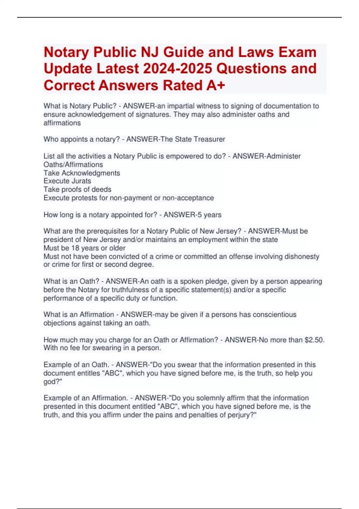 Notary Public NJ Guide and Laws Exam Update Latest Questions and Correct Answers Rated A+