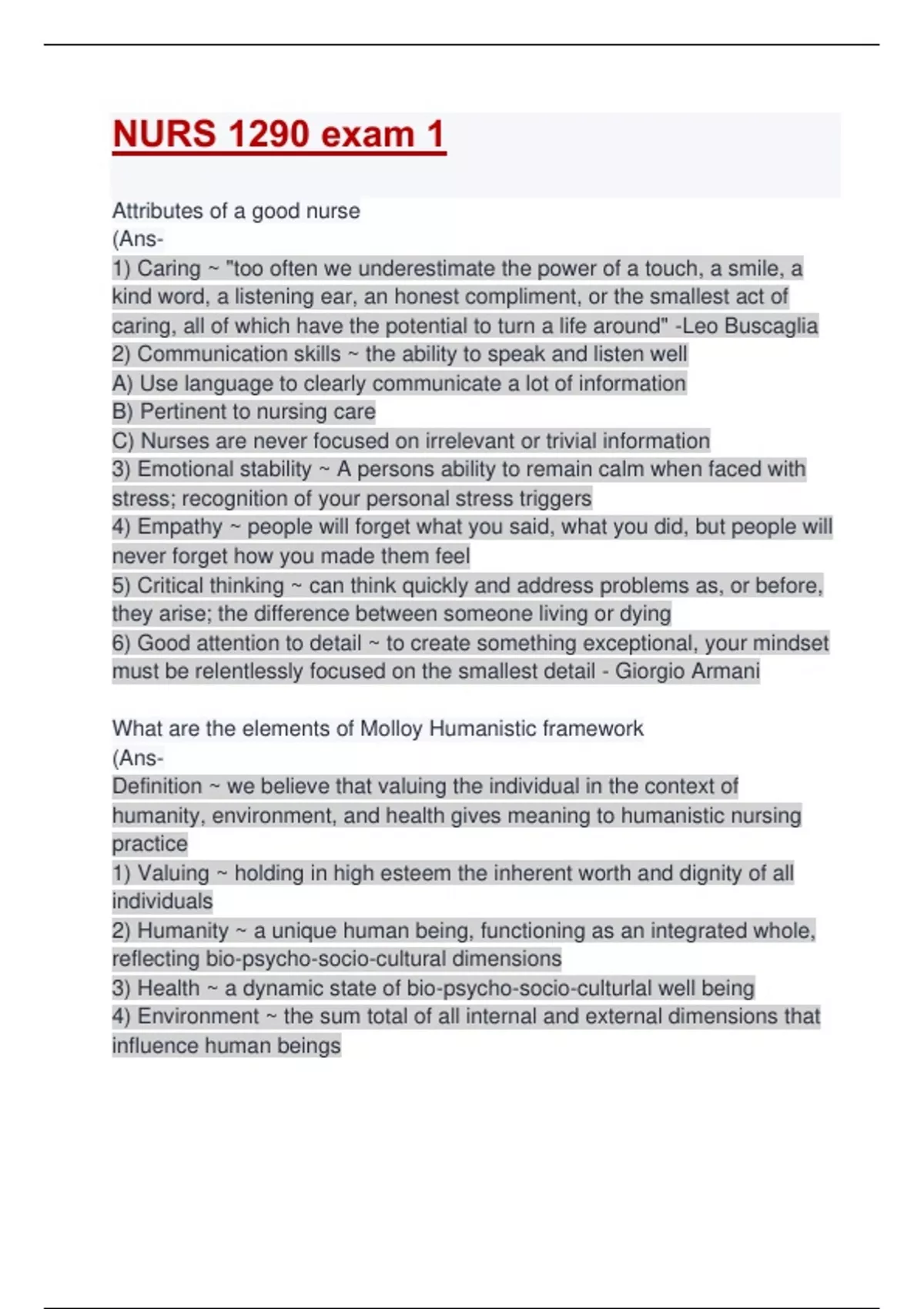 Attributes of a good nurse (Ans- 1) Caring ~ "too often we underestimate the power of a touch, a smile, a kind word, a listening ear, an honest compliment, or the smallest act of caring, all of which have the potential to turn a life around" -Leo Buscaglia 2) Communication skills ~ the ability to speak and listen well A) Use language to clearly communicate a lot of information B) Pertinent to nursing care C) Nurses are never focused on irrelevant or trivial information 3) Emotional stability ~ A persons ability to remain calm when faced with stress; recognition of your personal stress triggers 4) Empathy ~ people will forget what you said, what you did, but people will never forget how you made them feel 5) Critical thinking ~ can think quickly and address problems as, or before, they arise; the difference between someone living or dying 6) Good attention to detail ~ to create something exceptional, your mindset must be relentlessly focused on the smallest detail - Giorgio Armani What are the elements of Molloy Humanistic framework (Ans- Definition ~ we believe that valuing the individual in the context of humanity, environment, and health gives meaning to humanistic nursing practice 1) Valuing ~ holding in high esteem the inherent worth and dignity of all individuals 2) Humanity ~ a unique human being, functioning as an integrated whole, reflecting bio-psycho-socio-cultural dimensions 3) Health ~ a dynamic state of bio-psycho-socio-culturlal well being 4) Environment ~ the sum total of all internal and external dimensions that influence human beings State to state analysis forecasted(?) a shortage of registered nurses between . According to the US bureau of Labor Statistics, what was the prediction discussed in class for RNs? (Ans- The current total of number of RNs will not meet the demand for the workforce(?) Prior to the modern era, how was safe nursing care provided? (Ans- 1) women traditionally provided nurturance at home 2) safest nursing care was provided in ones own home 3) extended to sick and injured community 4) other societies included medicine men, shamans, and other male tribe members 5) no formal training - learned through oral traditions, passed from one generation to another, usually by trial and error. those with success were considered experts Throughout the years, what influences the practice of nursing? (Ans- tradition, authority, clinical experience and intuition, logical reasoning, and disciplined research Role of Deconess (Ans- The first visiting nurses Kaiserwerth Deaconess Institute (Ans- - Hospital and medical school with a 3 year course of study for Protestant deaconesses, including training in nursing, pharmacy, and teaching; - considered the most significant early - Protestant nursing organization. - opened by pastor theodur fliedur