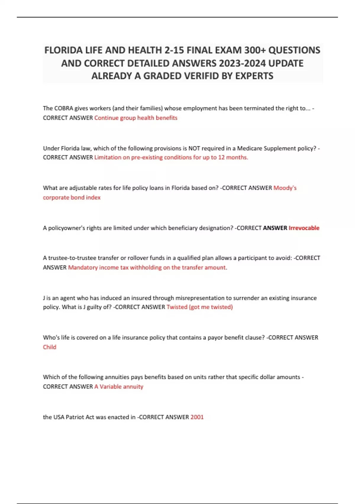 FLORIDA LIFE AND HEALTH 2-15 FINAL EXAM 300+ QUESTIONS AND CORRECT DETAILED ANSWERS UPDATE ALREADY A GRADED VERIFID BY EXPERTS
