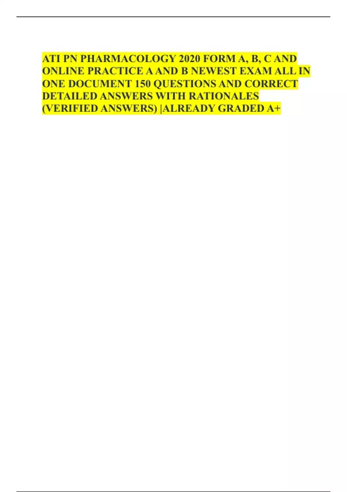 ATI PN PHARMACOLOGY 2020 FORM A, B, C AND ONLINE PRACTICE A AND B NEWEST EXAM ALL IN ONE DOCUMENT 150 QUESTIONS AND CORRECT DETAILED ANSWERS WITH RATIONALES (VERIFIED ANSWERS) |ALREADY GRADED A+