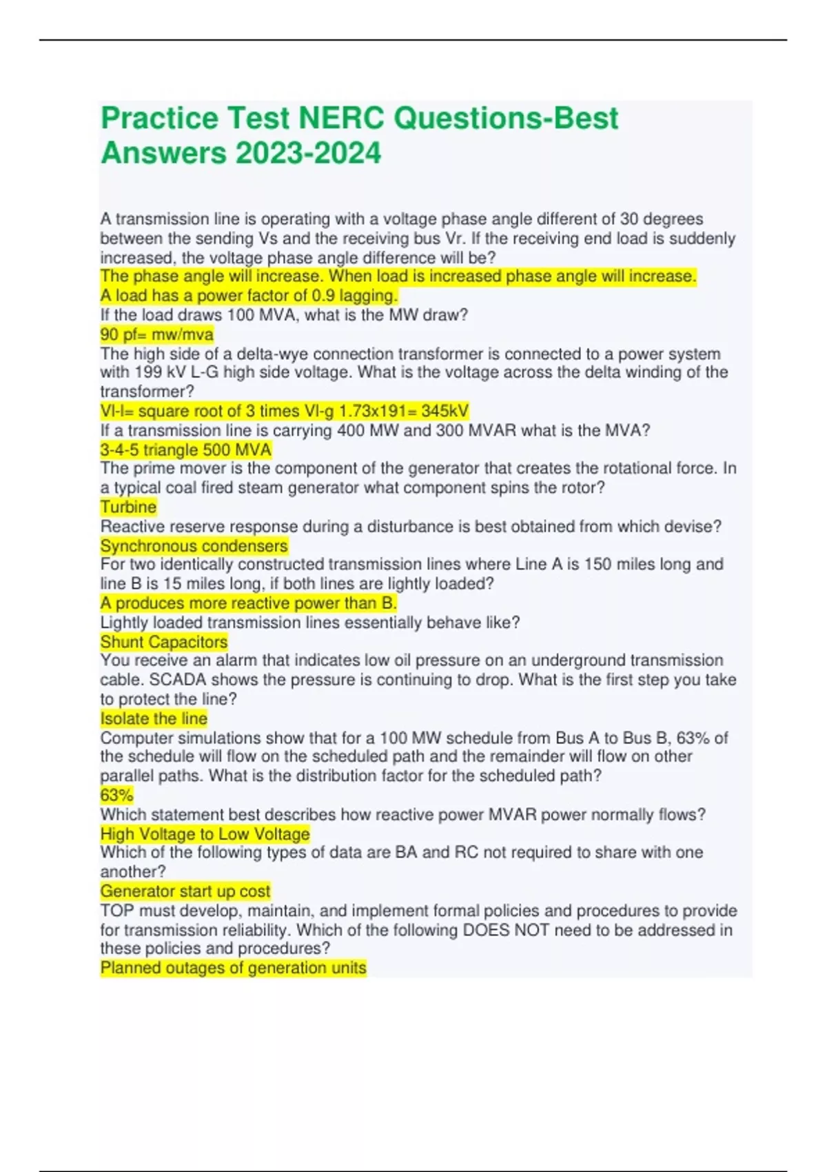 Practice Test NERC Questions-Best Answers