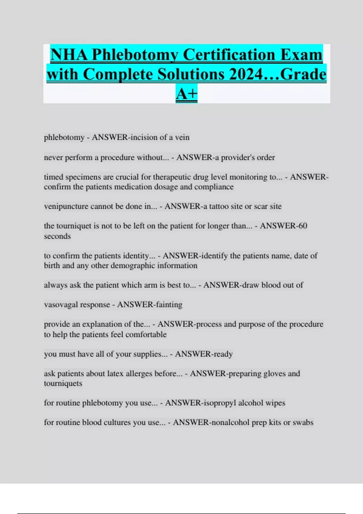 NHA Phlebotomy Certification Exam with Complete Solutions 2024…Grade A+ phlebotomy - ANSWER-incision of a vein never perform a procedure without... - ANSWER-a provider's order timed specimens are crucial for therapeutic drug level monitoring to... - ANSWERconfirm the patients medication dosage and compliance venipuncture cannot be done in... - ANSWER-a tattoo site or scar site the tourniquet is not to be left on the patient for longer than... - ANSWER-60 seconds to confirm the patients identity... - ANSWER-identify the patients name, date of birth and any other demographic information always ask the patient which arm is best to... - ANSWER-draw blood out of vasovagal response - ANSWER-fainting provide an explanation of the... - ANSWER-process and purpose of the procedure to help the patients feel comfortable you must have all of your supplies... - ANSWER-ready ask patients about latex allerges before... - ANSWER-preparing gloves and tourniquets for routine phlebotomy you use... - ANSWER-isopropyl alcohol wipes for routine blood cultures you use... - ANSWER-nonalcohol prep kits or swabs