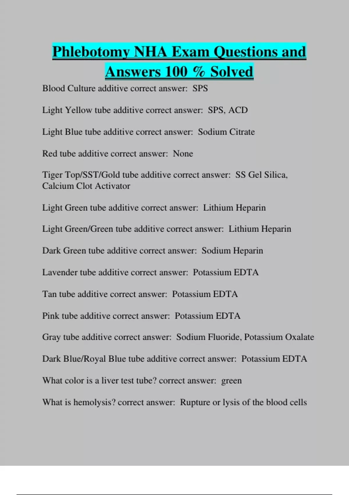Phlebotomy NHA Exam Questions and Answers 100 % Solved Blood Culture additive correct answer: SPS Light Yellow tube additive correct answer: SPS, ACD Light Blue tube additive correct answer: Sodium Citrate Red tube additive correct answer: None Tiger Top/SST/Gold tube additive correct answer: SS Gel Silica, Calcium Clot Activator Light Green tube additive correct answer: Lithium Heparin Light Green/Green tube additive correct answer: Lithium Heparin Dark Green tube additive correct answer: Sodium Heparin Lavender tube additive correct answer: Potassium EDTA Tan tube additive correct answer: Potassium EDTA Pink tube additive correct answer: Potassium EDTA Gray tube additive correct answer: Sodium Fluoride, Potassium Oxalate Dark Blue/Royal Blue tube additive correct answer: Potassium EDTA What color is a liver test tube? correct answer: green What is hemolysis? correct answer: Rupture or lysis of the blood cells