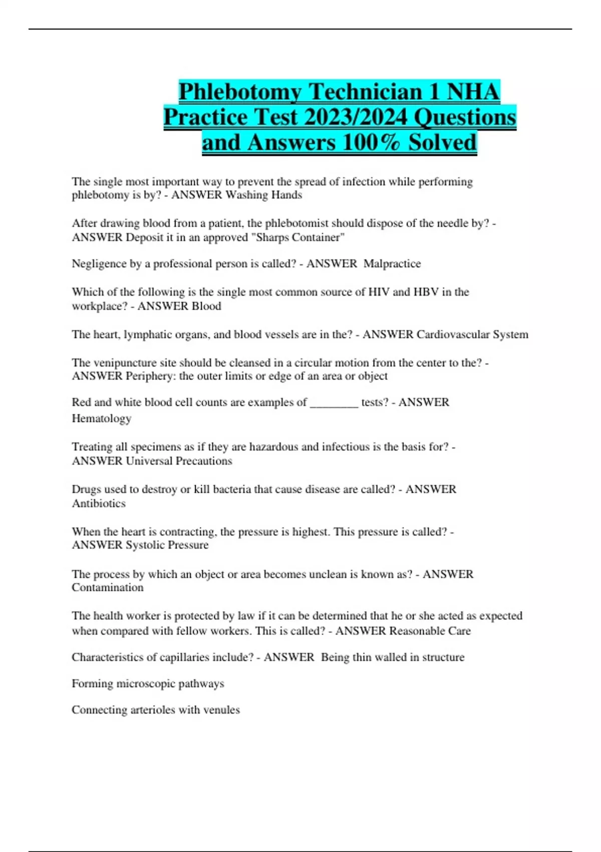 Phlebotomy Technician 1 NHA Practice Test 2023/2024 Questions and Answers 100% Solved The single most important way to prevent the spread of infection while performing phlebotomy is by? - ANSWER Washing Hands After drawing blood from a patient, the phlebotomist should dispose of the needle by? - ANSWER Deposit it in an approved "Sharps Container" Negligence by a professional person is called? - ANSWER Malpractice Which of the following is the single most common source of HIV and HBV in the workplace? - ANSWER Blood The heart, lymphatic organs, and blood vessels are in the? - ANSWER Cardiovascular System The venipuncture site should be cleansed in a circular motion from the center to the? - ANSWER Periphery: the outer limits or edge of an area or object Red and white blood cell counts are examples of ________ tests? - ANSWER Hematology Treating all specimens as if they are hazardous and infectious is the basis for? - ANSWER Universal Precautions Drugs used to destroy or kill bacteria that cause disease are called? - ANSWER Antibiotics When the heart is contracting, the pressure is highest. This pressure is called? - ANSWER Systolic Pressure The process by which an object or area becomes unclean is known as? - ANSWER Contamination The health worker is protected by law if it can be determined that he or she acted as expected when compared with fellow workers. This is called? - ANSWER Reasonable Care Characteristics of capillaries include? - ANSWER Being thin walled in structure Forming microscopic pathways Connecting arterioles with venules