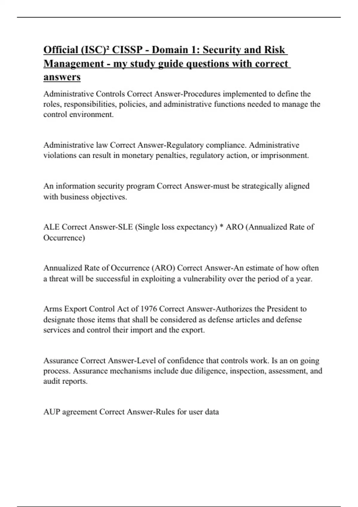 Administrative Controls Correct Answer-Procedures implemented to define the roles, responsibilities, policies, and administrative functions needed to manage the control environment. Administrative law Correct Answer-Regulatory compliance. Administrative violations can result in monetary penalties, regulatory action, or imprisonment. An information security program Correct Answer-must be strategically aligned with business objectives. ALE Correct Answer-SLE (Single loss expectancy) * ARO (Annualized Rate of Occurrence) Annualized Rate of Occurrence (ARO) Correct Answer-An estimate of how often a threat will be successful in exploiting a vulnerability over the period of a year. Arms Export Control Act of 1976 Correct Answer-Authorizes the President to designate those items that shall be considered as defense articles and defense services and control their import and the export. Assurance Correct Answer-Level of confidence that controls work. Is an on going process. Assurance mechanisms include due diligence, inspection, assessment, and audit reports. AUP agreement Correct Answer-Rules for user data AV Correct Answer-Asset value in dollars