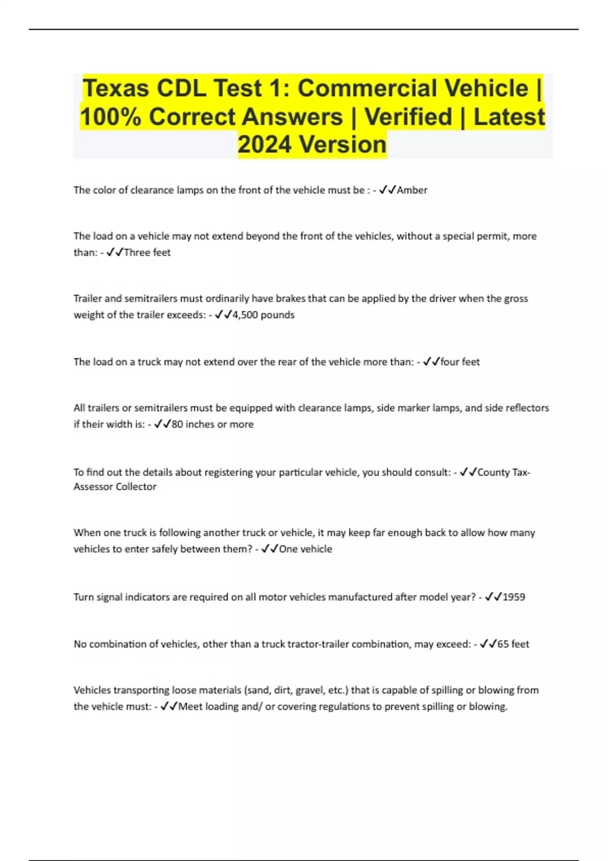 Texas CDL Test 1: Commercial Vehicle | 100% Correct Answers | Verified | Latest 2024 Version
