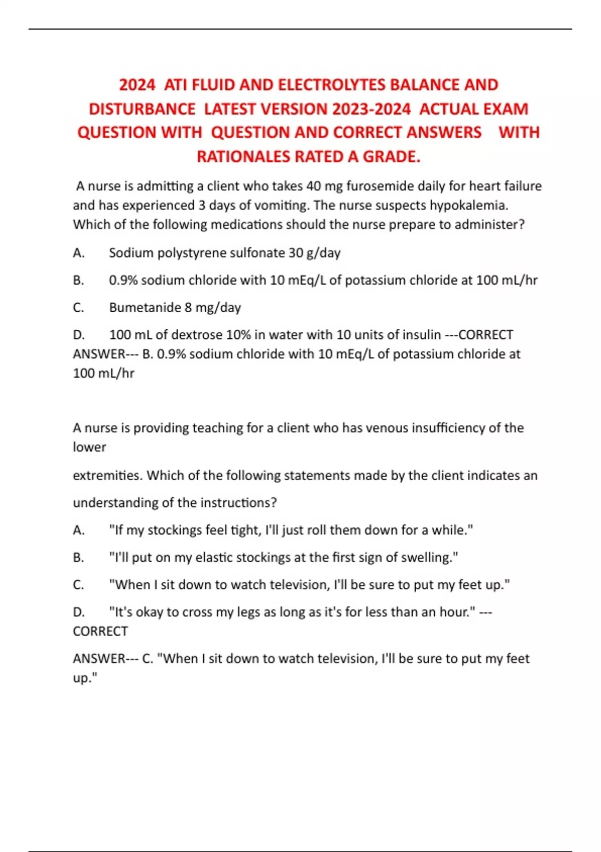 2024 ATI FLUID AND ELECTROLYTES BALANCE AND DISTURBANCE LATEST VERSION ACTUAL EXAM QUESTION WITH QUESTION AND CORRECT ANSWERS WITH RATIONALES RATED A GRADE.