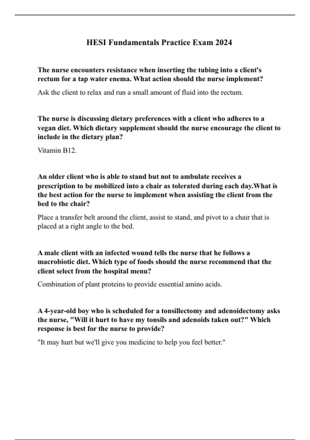 The nurse encounters resistance when inserting the tubing into a client's rectum for a tap water enema. What action should the nurse implement? Ask the client to relax and run a small amount of fluid into the rectum. The nurse is discussing dietary preferences with a client who adheres to a vegan diet. Which dietary supplement should the nurse encourage the client to include in the dietary plan? Vitamin B12. An older client who is able to stand but not to ambulate receives a prescription to be mobilized into a chair as tolerated during each day.What is the best action for the nurse to implement when assisting the client from the bed to the chair? Place a transfer belt around the client, assist to stand, and pivot to a chair that is placed at a right angle to the bed. A male client with an infected wound tells the nurse that he follows a macrobiotic diet. Which type of foods should the nurse recommend that the client select from the hospital menu? Combination of plant proteins to provide essential amino acids. A 4-year-old boy who is scheduled for a tonsillectomy and adenoidectomy asks the nurse, "Will it hurt to have my tonsils and adenoids taken out?" Which response is best for the nurse to provide? "It may hurt but we'll give you medicine to help you feel better."When the nurse enters a client's room to do an initial assessment, the client shouts, "Get out of my room! I'm tired of being bothered!" How should the nurse respond? "What is concerning you this morning?" Which statement correctly identifies a written learning objective for a client with peripheral vascular disease? Upon discharge, the client will list three ways to protect the feet from injury. The nurse is providing passive range of motion (ROM) exercises to the hip and knee for a client who is unconscious. After supporting the client's knee with one hand, what action should the nurse take next? Cradle the client's heel. While preparing to insert a rectal suppository in a male adult client, the nurse observes that the client is holding his breath while bearing down. What action should the nurse implement? Instruct the client to take slow deep breaths and stop bearing down. What action should the nurse implement when adding sterile liquids to a sterile field? Consider the sterile field contaminated if it becomes wet during the procedure. When assessing a client with a nursing diagnosis of fluid volume deficit, the nurse notes that the client's skin over the sternum "tents" when gently pinched. Which action should the nurse implement? Continue the planned nursing interventions to restore the client's fluid volume.A client is admitted to the hospital with intractable pain. What instruction should the nurse provide the unlicensed assistive personnel (UAP) who is preparing to assist this client with a bed bath? Take measures to promote as much comfort as possible. The nurse is preparing to irrigate a client's indwelling urinary catheter using an open technique. What action should the nurse take after applying gloves? Draw up the irrigating solution into the syringe. The nurse is administering an intermittent infusion of an antibiotic to a client whose intravenous (IV) access is an antecubital saline lock. After the nurse opens the roller clamp on the IV tubing, the alarm on the infusion pump indicates an obstruction. What action should the nurse take first? Reposition the client's arm. What intervention should the nurse include in the plan of care for a client who is being treated with an Unna’s paste boot for leg ulcers due to chronic venous insufficiency? Check capillary refill of toes on lower extremity with Unna's paste boot. A client is admitted with a stage four pressure ulcer that has a black, hardened surface and a light-pink wound bed with a malodorous green drainage. Which dressing is best for the nurse to use first? Wet to moist dressing. A female client informs the nurse that she uses herbal therapies to supplement her diet and manage common ailments. What information should the nurse offer the client about general use of herbal supplements? Herbs should be obtained from manufacturers with a history of quality control of their supplements.