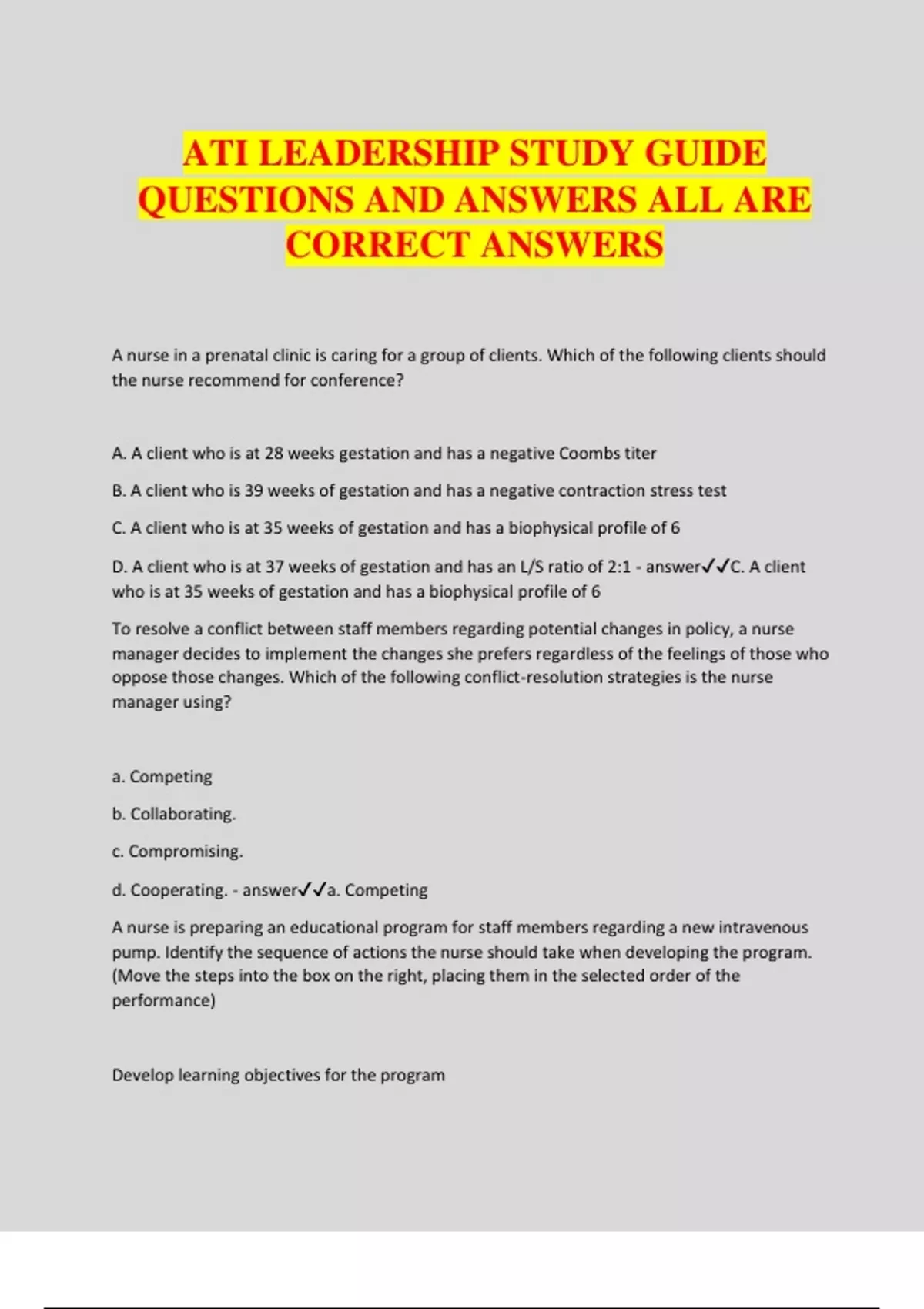 ATI LEADERSHIP STUDY GUIDE QUESTIONS AND ANSWERS ALL ARE CORRECT ANSWERS
