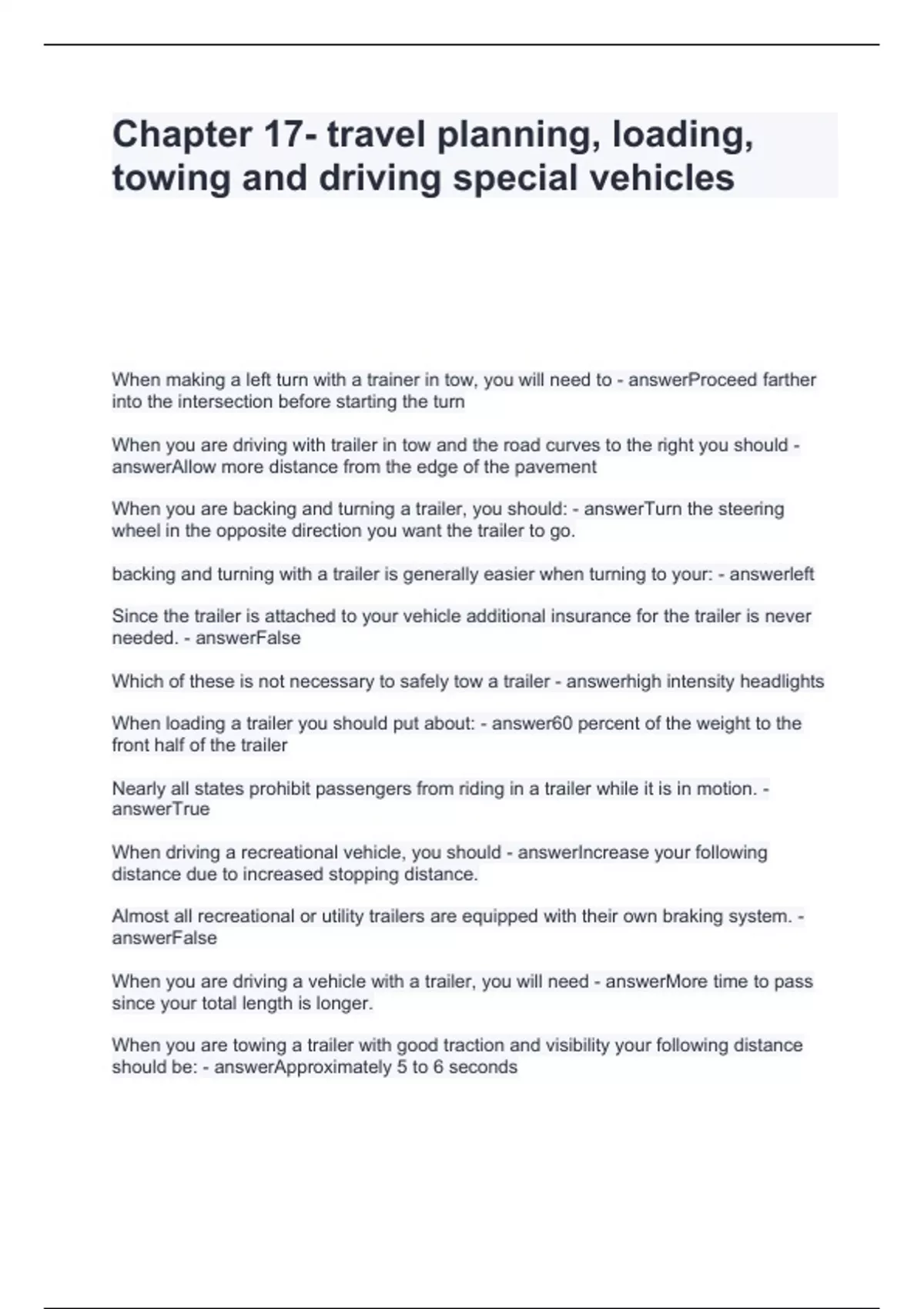 Chapter 17- travel planning, loading, towing and driving special vehicles Questions and Answers 2024