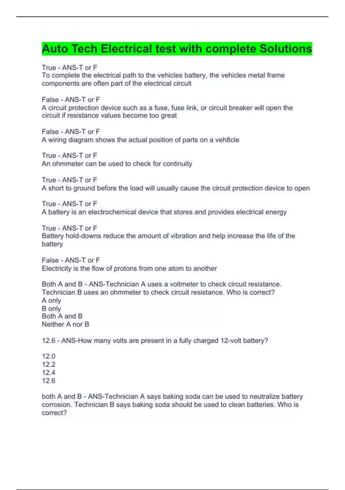 auto tech electrical test with complete solutions