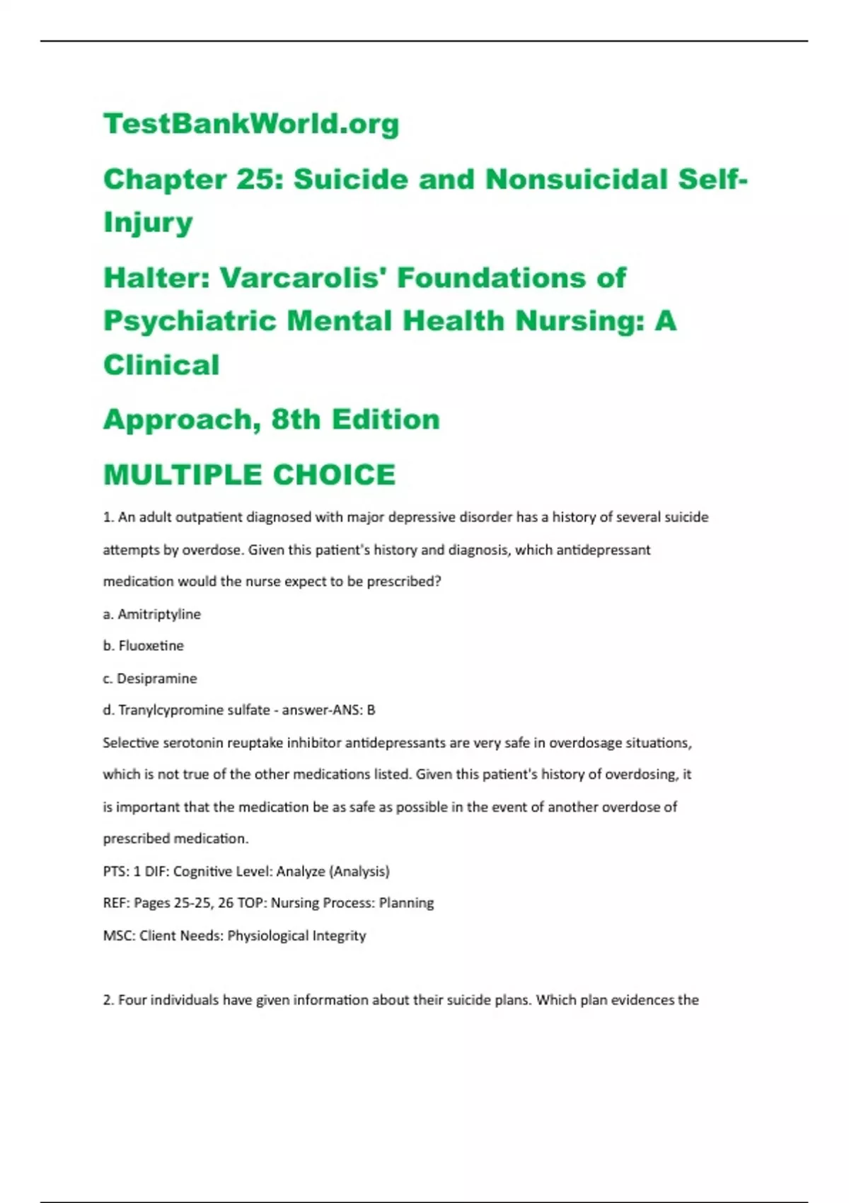 TestBankWorld.org Chapter 25: Suicide and Nonsuicidal SelfInjury Halter: Varcarolis' Foundations of Psychiatric Mental Health Nursing: A Clinical Approach, 8th Edition MULTIPLE CHOICE