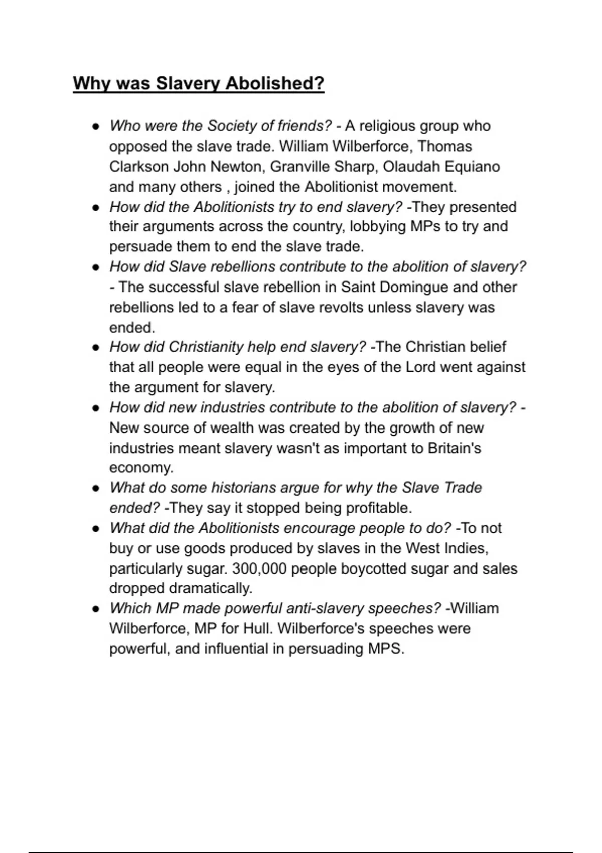 Why was Slavery Abolished?. This documents uncovers the process of the abolition of slavery in britain in the 18th to 19th century . It mention's histories most important figures , who contributed to end of slavery . Figures like : Equiano Olaudah , Sojourner Truth , William Wilberforce and Josiah wedgewood . It also breaches into modern slavery and the differnt forms of slavery in the modern era .