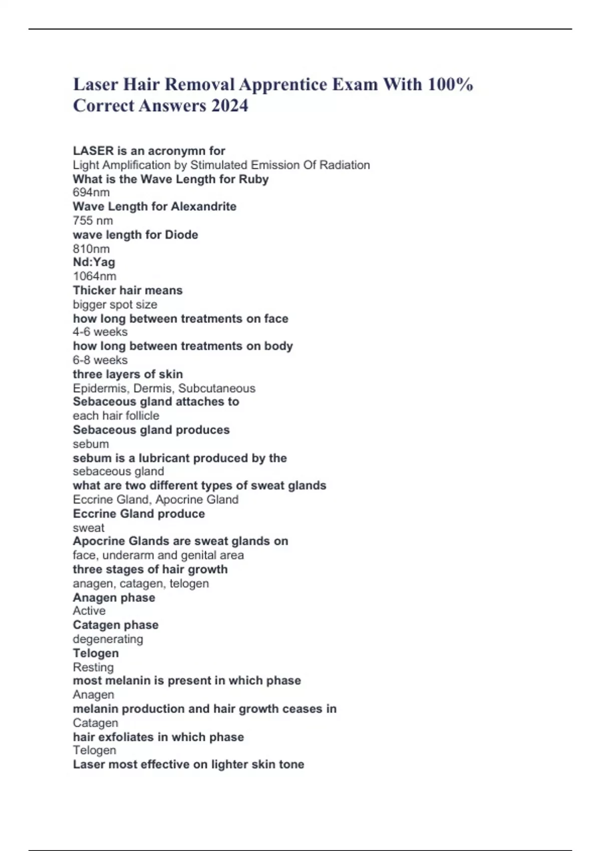 Laser Hair Removal Apprentice Exam With 100% Correct Answers 2024 LASER is an acronymn for Light Amplification by Stimulated Emission Of Radiation What is the Wave Length for Ruby 694nm Wave Length for Alexandrite 755 nm wave length for Diode 810nm Nd:Yag 1064nm Thicker hair means bigger spot size how long between treatments on face 4-6 weeks how long between treatments on body 6-8 weeks three layers of skin Epidermis, Dermis, Subcutaneous Sebaceous gland attaches to each hair follicle Sebaceous gland produces sebum sebum is a lubricant produced by the sebaceous gland what are two different types of sweat glands Eccrine Gland, Apocrine Gland Eccrine Gland produce sweat Apocrine Glands are sweat glands on face, underarm and genital area three stages of hair growth anagen, catagen, telogen Anagen phase Active Catagen phase degenerating Telogen Resting most melanin is present in which phase Anagen melanin production and hair growth ceases in Catagen hair exfoliates in which phase Telogen Laser most effective on lighter skin tone Alex who do you report to in the state of Texas Department of State Health Services what is melanin pigment produced in the bulb and bulge of the hair and the basal layer of the epidermis what color hair is laser attracted to brown and black two different types of melanin Eumelanin and pheomelanin Eumelanin is considered "True Color" what melanin is 50% more absorption Eumelanin What melanin is Reddish Brown Pheomelanin Can women with PCOS be treated successfully with Laser Hair Removal Therapy Yes Bulge relates what hair growth cycle 2 different causes of excessive hair Hypertrichosis and Hirsutism Hypertrichosis is wolf like facial hair "wolf man" Hirsutism women grow hair in same places as men "bearded lady" Perifollicular edema PFE red swollen goose bumps most laser require what before treatment area to be shaved thermal relaxation time reduce temperature by 50% after addition of heat Thermal Relaxation becomes and important theory determining pulse duration or pulse width how long should someone wait before treatment after being in the sun 4 weeks too long of a pulse duration/width may cause the treatment to be ineffective typical time frame for treatments on a patients face 1 treatment every 4-6 weeks if there are different spot sizes on handpieces you should use a smaller spot size with thinner or smaller hair larger spot size thicker or course hair after laser treatment patient should wait to expose skin to sun for 1 week how often should technician wipe down equipment in between every client most important chromophore the laser targets in hair remov