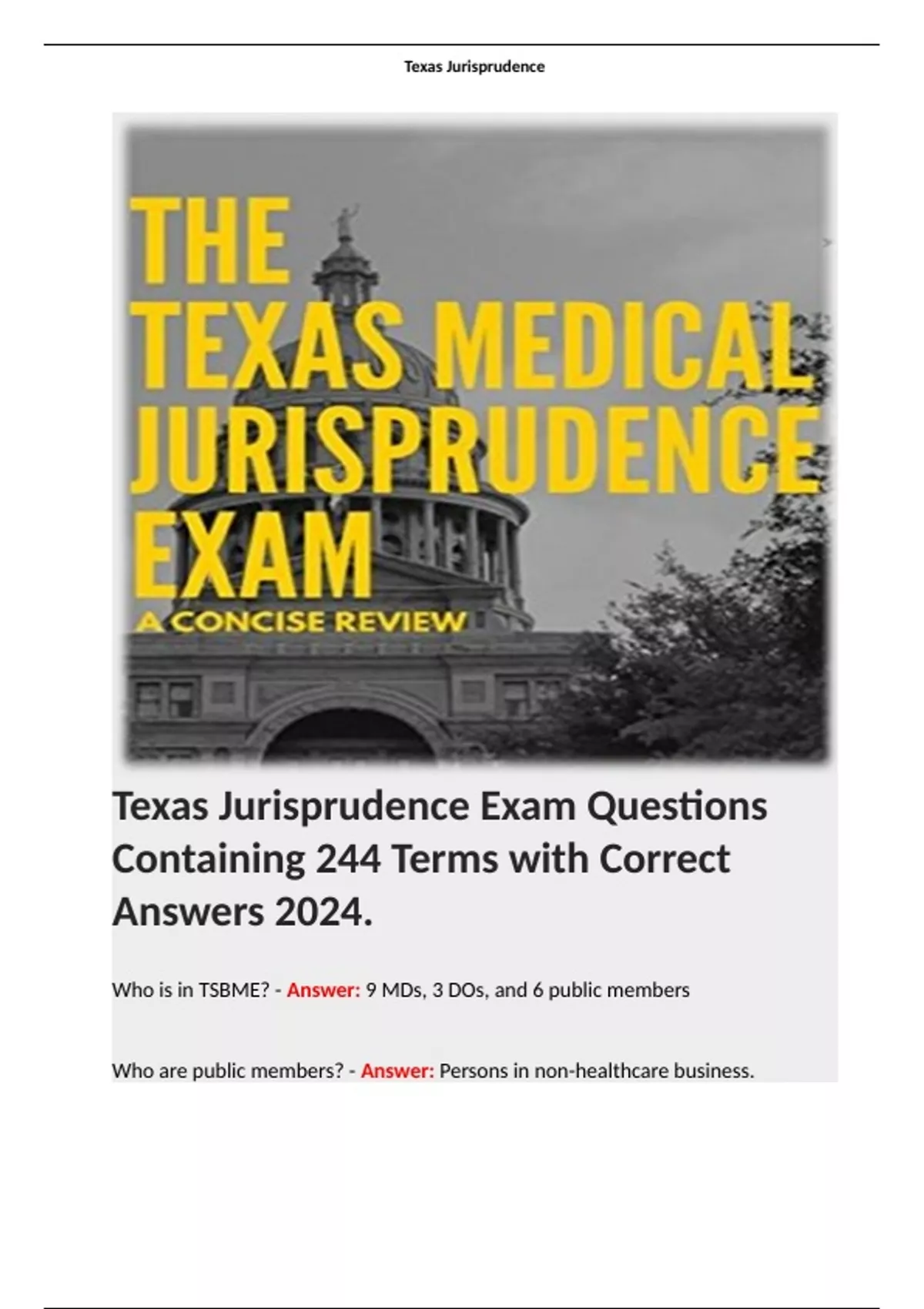Texas Jurisprudence Exam Questions Containing 244 Terms with Correct Answers 2024. Terms like; Who is in TSBME? - Answer: 9 MDs, 3 DOs, and 6 public members