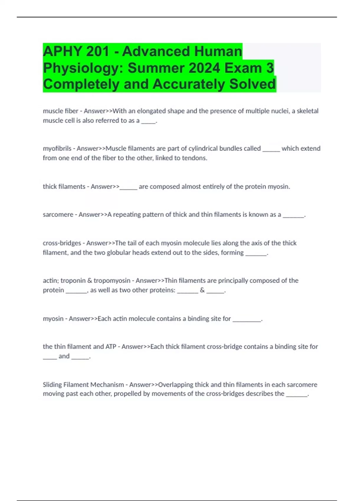 APHY 201 - Advanced Human Physiology: Summer 2024 Exam 3 Completely and Accurately Solved muscle fiber - Answer>>With an elongated shape and the presence of multiple nuclei, a skeletal muscle cell is also referred to as a ____. myofibrils - Answer>>Muscle filaments are part of cylindrical bundles called _____ which extend from one end of the fiber to the other, linked to tendons. thick filaments - Answer>>_____ are composed almost entirely of the protein myosin. sarcomere - Answer>>A repeating pattern of thick and thin filaments is known as a ______. cross-bridges - Answer>>The tail of each myosin molecule lies along the axis of the thick filament, and the two globular heads extend out to the sides, forming ______. actin; troponin & tropomyosin - Answer>>Thin filaments are principally composed of the protein ______, as well as two other proteins: ______ & _____. myosin - Answer>>Each actin molecule contains a binding site for ________. the thin filament and ATP - Answer>>Each thick filament cross-bridge contains a binding site for ____ and _____. Sliding Filament Mechanism - Answer>>Overlapping thick and thin filaments in each sarcomere moving past each other, propelled by movements of the cross-bridges describes the ______.