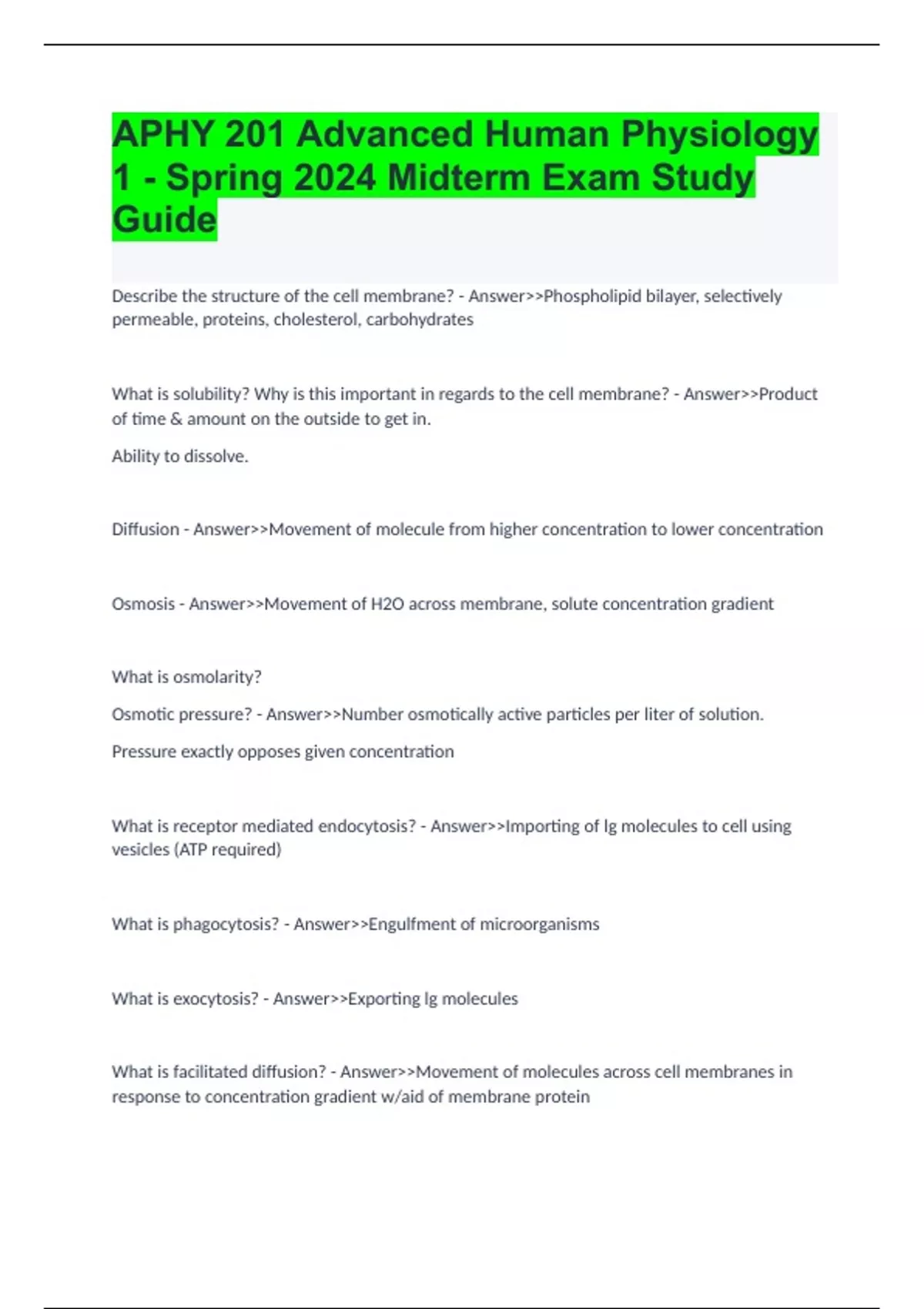 APHY 201 Advanced Human Physiology 1 - Spring 2024 Midterm Exam Study Guide Describe the structure of the cell membrane? - Answer>>Phospholipid bilayer, selectively permeable, proteins, cholesterol, carbohydrates What is solubility? Why is this important in regards to the cell membrane? - Answer>>Product of time & amount on the outside to get in. Ability to dissolve. Diffusion - Answer>>Movement of molecule from higher concentration to lower concentration Osmosis - Answer>>Movement of H2O across membrane, solute concentration gradient What is osmolarity? Osmotic pressure? - Answer>>Number osmotically active particles per liter of solution. Pressure exactly opposes given concentration What is receptor mediated endocytosis? - Answer>>Importing of lg molecules to cell using vesicles (ATP required) What is phagocytosis? - Answer>>Engulfment of microorganisms