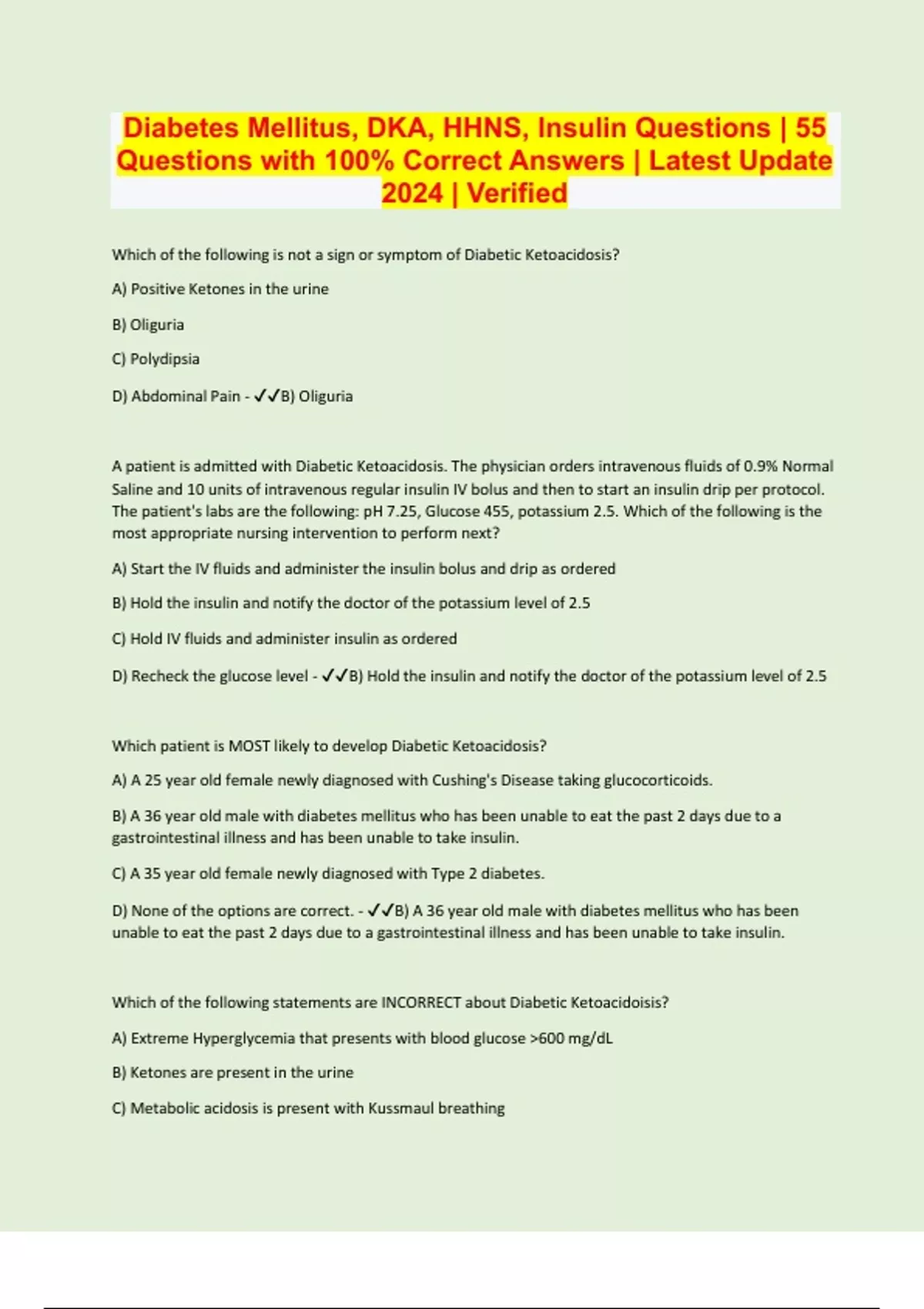 Diabetes Mellitus, DKA, HHNS, Insulin Questions | 55 Questions with 100% Correct Answers | Latest Update 2024 | Verified