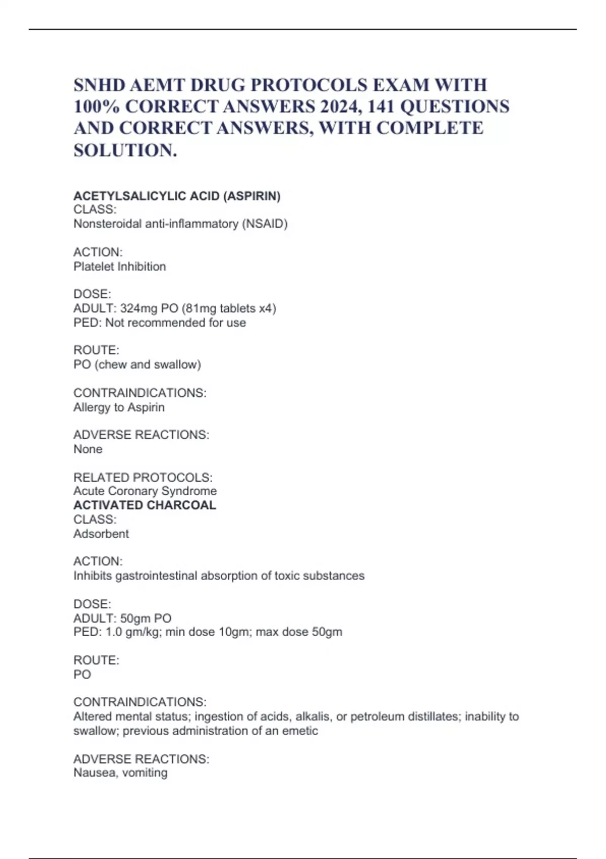 SNHD AEMT DRUG PROTOCOLS EXAM WITH 100% CORRECT ANSWERS 2024, 141 QUESTIONS AND CORRECT ANSWERS, WITH COMPLETE SOLUTION. ACETYLSALICYLIC ACID (ASPIRIN) CLASS: Nonsteroidal anti-inflammatory (NSAID) ACTION: Platelet Inhibition DOSE: ADULT: 324mg PO (81mg tablets x4) PED: Not recommended for use ROUTE: PO (chew and swallow) CONTRAINDICATIONS: Allergy to Aspirin ADVERSE REACTIONS: None RELATED PROTOCOLS: Acute Coronary Syndrome ACTIVATED CHARCOAL CLASS: Adsorbent ACTION: Inhibits gastrointestinal absorption of toxic substances DOSE: ADULT: 50gm PO PED: 1.0 gm/kg; min dose 10gm; max dose 50gm ROUTE: PO CONTRAINDICATIONS: Altered mental status; ingestion of acids, alkalis, or petroleum distillates; inability to swallow; previous administration of an emetic ADVERSE REACTIONS: Nausea, vomiting