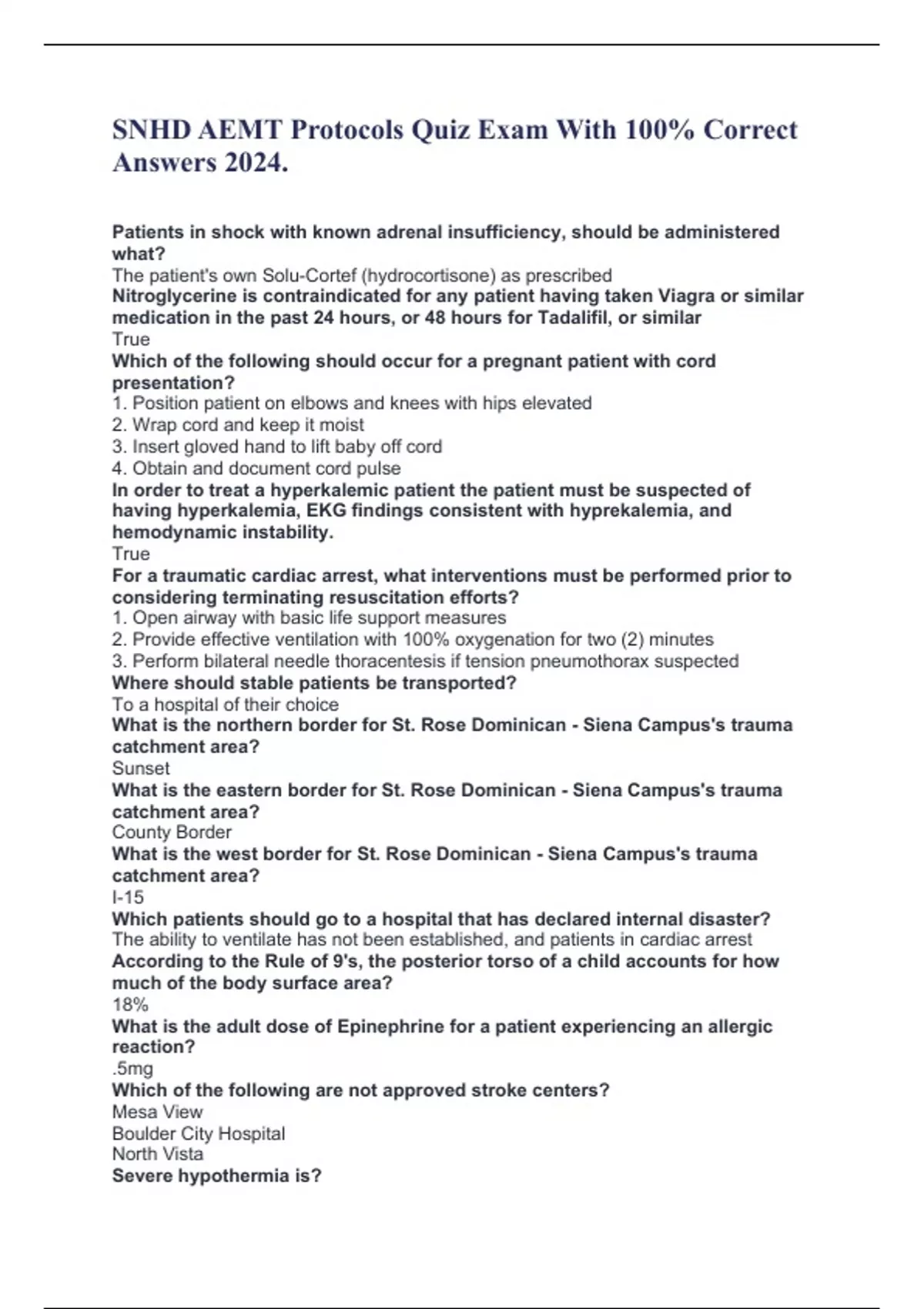 SNHD AEMT Protocols Quiz Exam With 100% Correct Answers 2024. Patients in shock with known adrenal insufficiency, should be administered what? The patient's own Solu-Cortef (hydrocortisone) as prescribed Nitroglycerine is contraindicated for any patient having taken Viagra or similar medication in the past 24 hours, or 48 hours for Tadalifil, or similar True Which of the following should occur for a pregnant patient with cord presentation? 1. Position patient on elbows and knees with hips elevated 2. Wrap cord and keep it moist 3. Insert gloved hand to lift baby off cord 4. Obtain and document cord pulse In order to treat a hyperkalemic patient the patient must be suspected of having hyperkalemia, EKG findings consistent with hyprekalemia, and hemodynamic instability. True For a traumatic cardiac arrest, what interventions must be performed prior to considering terminating resuscitation efforts? 1. Open airway with basic life support measures 2. Provide effective ventilation with 100% oxygenation for two (2) minutes 3. Perform bilateral needle thoracentesis if tension pneumothorax suspected Where should stable patients be transported? To a hospital of their choice What is the northern border for St. Rose Dominican - Siena Campus's trauma catchment area? Sunset What is the eastern border for St. Rose Dominican - Siena Campus's trauma catchment area? County Border What is the west border for St. Rose Dominican - Siena Campus's trauma catchment area? I-15 Which patients should go to a hospital that has declared internal disaster? The ability to ventilate has not been established, and patients in cardiac arrest According to the Rule of 9's, the posterior torso of a child accounts for how much of the body surface area? 18% What is the adult dose of Epinephrine for a patient experiencing an allergic reaction? .5mg Which of the following are not approved stroke centers? Mesa View Boulder City Hospital North Vista Severe hypothermia is?