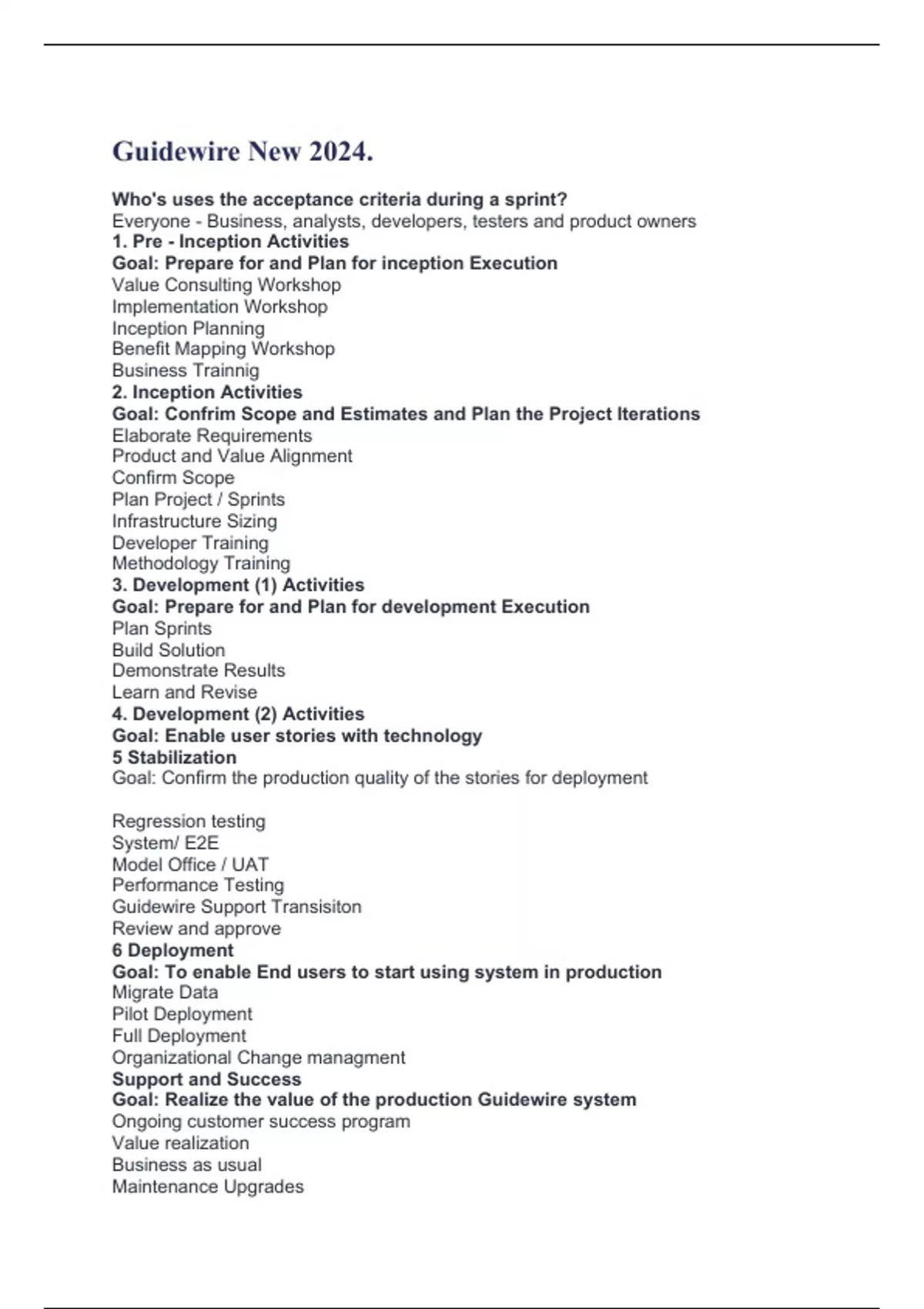 Guidewire New 2024. Who's uses the acceptance criteria during a sprint? Everyone - Business, analysts, developers, testers and product owners 1. Pre - Inception Activities Goal: Prepare for and Plan for inception Execution Value Consulting Workshop Implementation Workshop Inception Planning Benefit Mapping Workshop Business Trainnig 2. Inception Activities Goal: Confrim Scope and Estimates and Plan the Project Iterations Elaborate Requirements Product and Value Alignment Confirm Scope Plan Project / Sprints Infrastructure Sizing Developer Training Methodology Training 3. Development (1) Activities Goal: Prepare for and Plan for development Execution Plan Sprints Build Solution Demonstrate Results Learn and Revise 4. Development (2) Activities Goal: Enable user stories with technology 5 Stabilization Goal: Confirm the production quality of the stories for deployment Regression testing System/ E2E Model Office / UAT Performance Testing Guidewire Support Transisiton Review and approve 6 Deployment Goal: To enable End users to start using system in production Migrate Data Pilot Deployment Full Deployment Organizational Change managment Support and Success Goal: Realize the value of the production Guidewire system Ongoing customer success program Value realization Business as usual Maintenance Upgrades