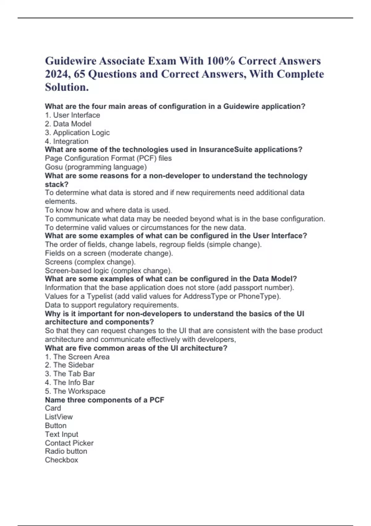 Guidewire Associate Exam With 100% Correct Answers 2024, 65 Questions and Correct Answers, With Complete Solution. What are the four main areas of configuration in a Guidewire application? 1. User Interface 2. Data Model 3. Application Logic 4. Integration What are some of the technologies used in InsuranceSuite applications? Page Configuration Format (PCF) files Gosu (programming language) What are some reasons for a non-developer to understand the technology stack? To determine what data is stored and if new requirements need additional data elements. To know how and where data is used. To communicate what data may be needed beyond what is in the base configuration. To determine valid values or circumstances for the new data. What are some examples of what can be configured in the User Interface? The order of fields, change labels, regroup fields (simple change). Fields on a screen (moderate change). Screens (complex change). Screen-based logic (complex change). What are some examples of what can be configured in the Data Model? Information that the base application does not store (add passport number). Values for a Typelist (add valid values for AddressType or PhoneType). Data to support regulatory requirements. Why is it important for non-developers to understand the basics of the UI architecture and components? So that they can request changes to the UI that are consistent with the base product architecture and communicate effectively with developers, What are five common areas of the UI architecture? 1. The Screen Area 2. The Sidebar 3. The Tab Bar 4. The Info Bar 5. The Workspace Name three components of a PCF Card ListView Button Text Input Contact Picker Radio button Checkbox