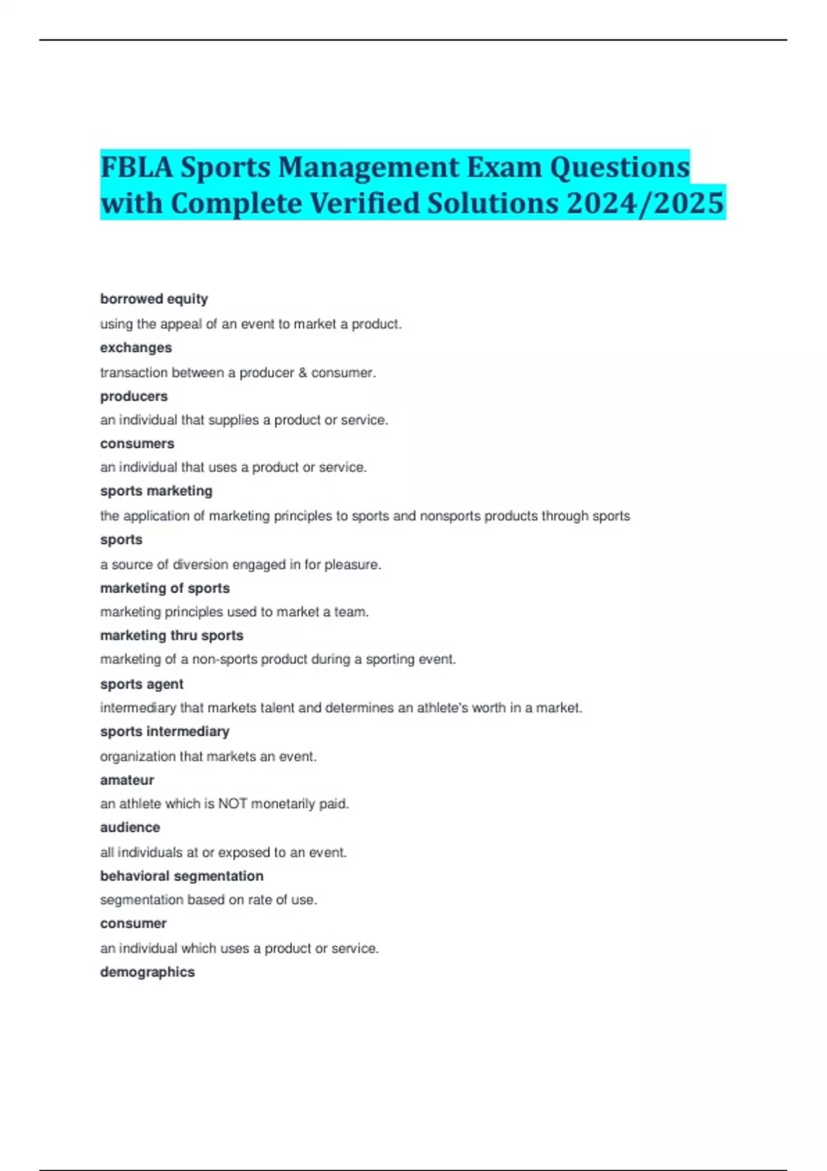 FBLA Sports Management Exam Questions with Complete Verified Solutions 2024/2025