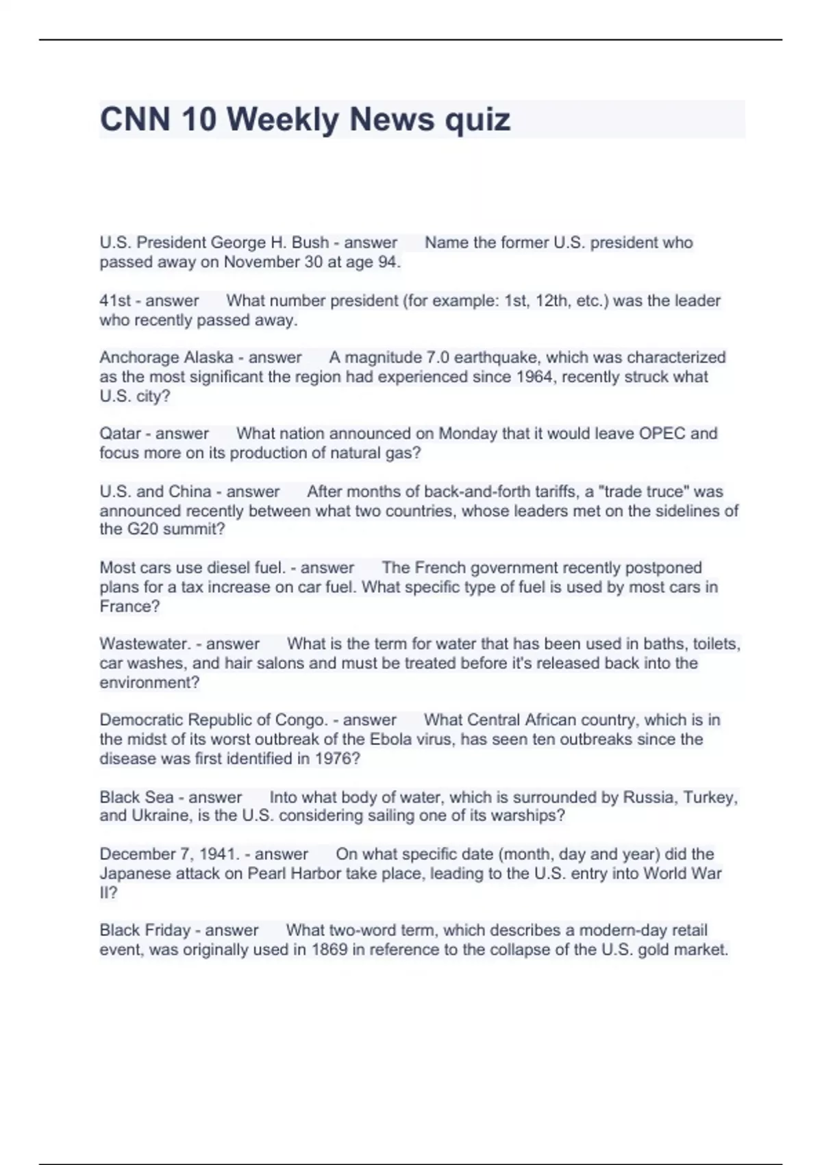 CNN 10 Weekly News quiz