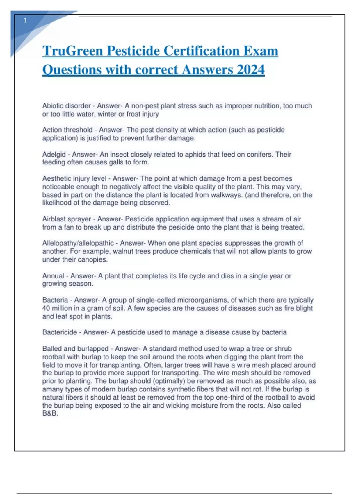 TruGreen Pesticide Certification Exam Questions with correct Answers 2024.