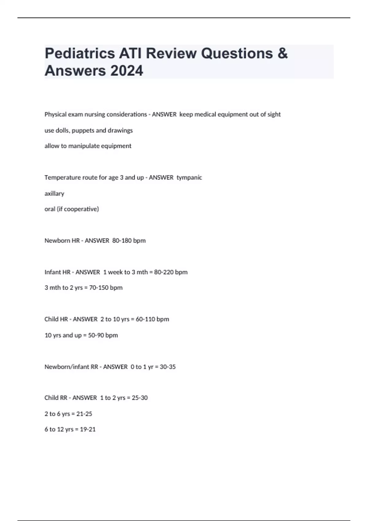 Pediatrics ATI Review Questions & Answers 2024 Physical exam nursing considerations keep medical equipment out of sight use dolls, puppets and drawings allow to manipulate equipment Temperature route for age 3 and up tympanic axillary oral (if cooperative) Newborn HR 80-180 bpm Infant HR 1 week to 3 mth = 80-220 bpm 3 mth to 2 yrs = 70-150 bpm Child HR 2 to 10 yrs = 60-110 bpm 10 yrs and up = 50-90 bpm
