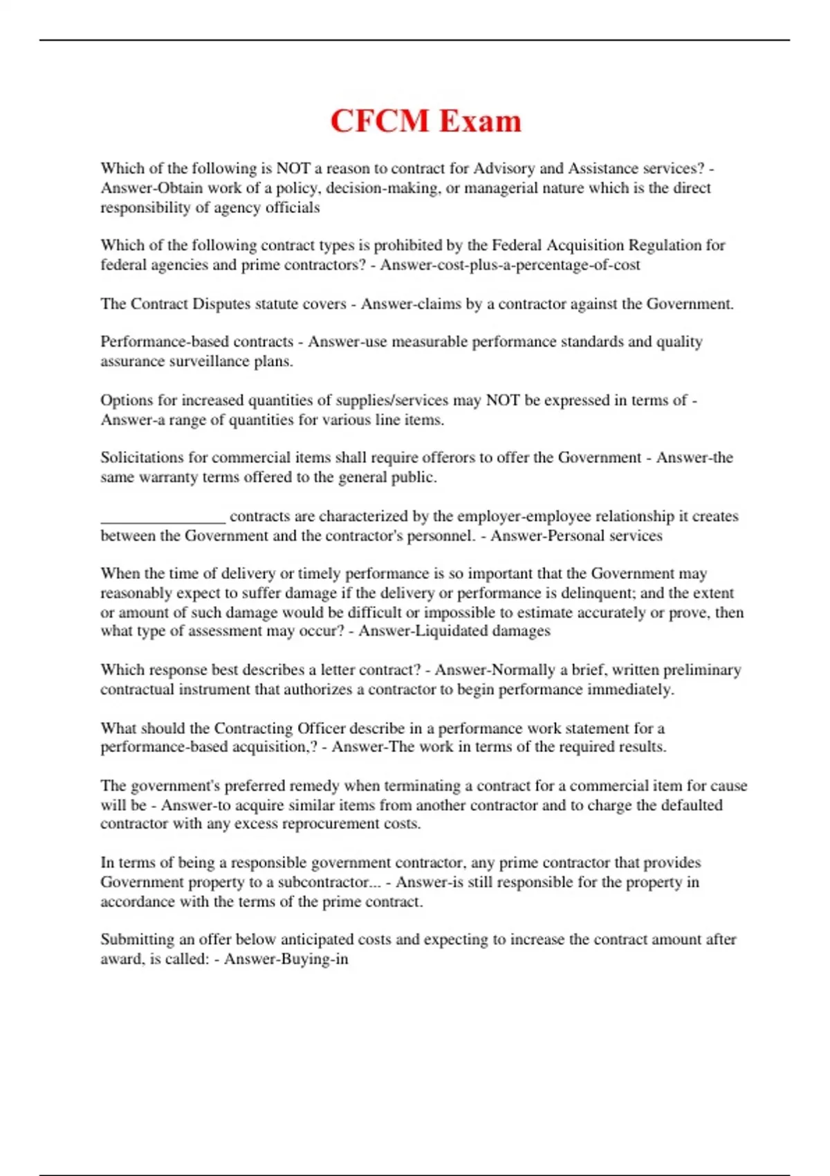 Which of the following is NOT a reason to contract for Advisory and Assistance services? - Answer-Obtain work of a policy, decision-making, or managerial nature which is the direct responsibility of agency officials Which of the following contract types is prohibited by the Federal Acquisition Regulation for federal agencies and prime contractors? - Answer-cost-plus-a-percentage-of-cost The Contract Disputes statute covers - Answer-claims by a contractor against the Government. Performance-based contracts - Answer-use measurable performance standards and quality assurance surveillance plans. Options for increased quantities of supplies/services may NOT be expressed in terms of - Answer-a range of quantities for various line items. Solicitations for commercial items shall require offerors to offer the Government - Answer-the same warranty terms offered to the general public. _______________ contracts are characterized by the employer-employee relationship it creates between the Government and the contractor's personnel. - Answer-Personal services When the time of delivery or timely performance is so important that the Government may reasonably expect to suffer damage if the delivery or performance is delinquent; and the extent or amount of such damage would be difficult or impossible to estimate accurately or prove, then what type of assessment may occur? - Answer-Liquidated damages Which response best describes a letter contract? - Answer-Normally a brief, written preliminary contractual instrument that authorizes a contractor to begin performance immediately. What should the Contracting Officer describe in a performance work statement for a performance-based acquisition,? - Answer-The work in terms of the required results. The government's preferred remedy when terminating a contract for a commercial item for cause will be - Answer-to acquire similar items from another contractor and to charge the defaulted contractor with any excess reprocurement costs. In terms of being a responsible government contractor, any prime contractor that provides Government property to a subcontractor... - Answer-is still responsible for the property in accordance with the terms of the prime contract. Submitting an offer below anticipated costs and expecting to increase the contract amount after award, is called: - Answer-Buying-in