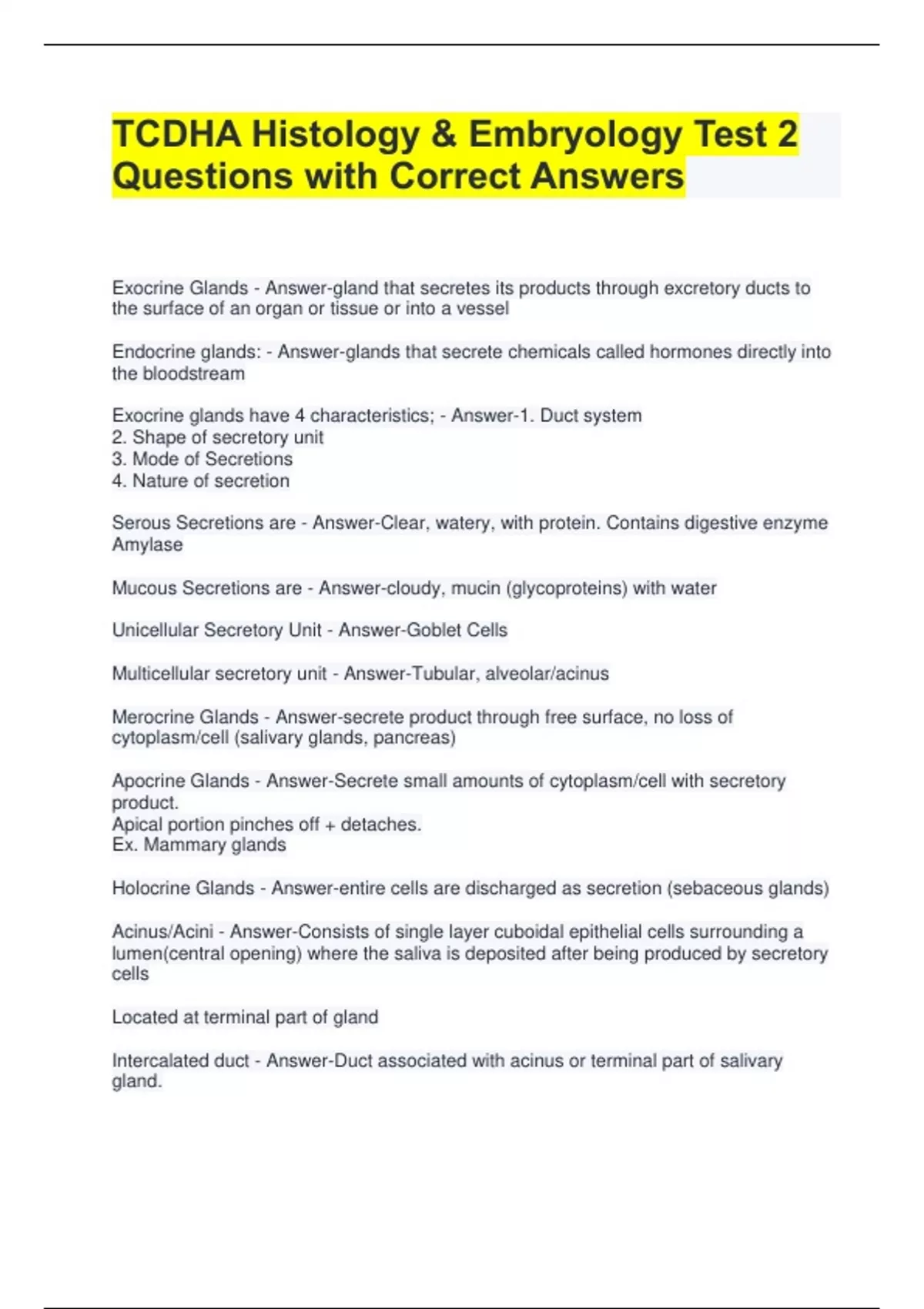 TCDHA Histology & Embryology Test 2 Questions with Correct Answers Exocrine Glands - Answer-gland that secretes its products through excretory ducts to the surface of an organ or tissue or into a vessel Endocrine glands: - Answer-glands that secrete chemicals called hormones directly into the bloodstream Exocrine glands have 4 characteristics; - Answer-1. Duct system 2. Shape of secretory unit 3. Mode of Secretions 4. Nature of secretion Serous Secretions are - Answer-Clear, watery, with protein. Contains digestive enzyme Amylase Mucous Secretions are - Answer-cloudy, mucin (glycoproteins) with water Unicellular Secretory Unit - Answer-Goblet Cells Multicellular secretory unit - Answer-Tubular, alveolar/acinus Merocrine Glands - Answer-secrete product through free surface, no loss of cytoplasm/cell (salivary glands, pancreas) Apocrine Glands - Answer-Secrete small amounts of cytoplasm/cell with secretory product. Apical portion pinches off + detaches. Ex. Mammary glands Holocrine Glands - Answer-entire cells are discharged as secretion (sebaceous glands)