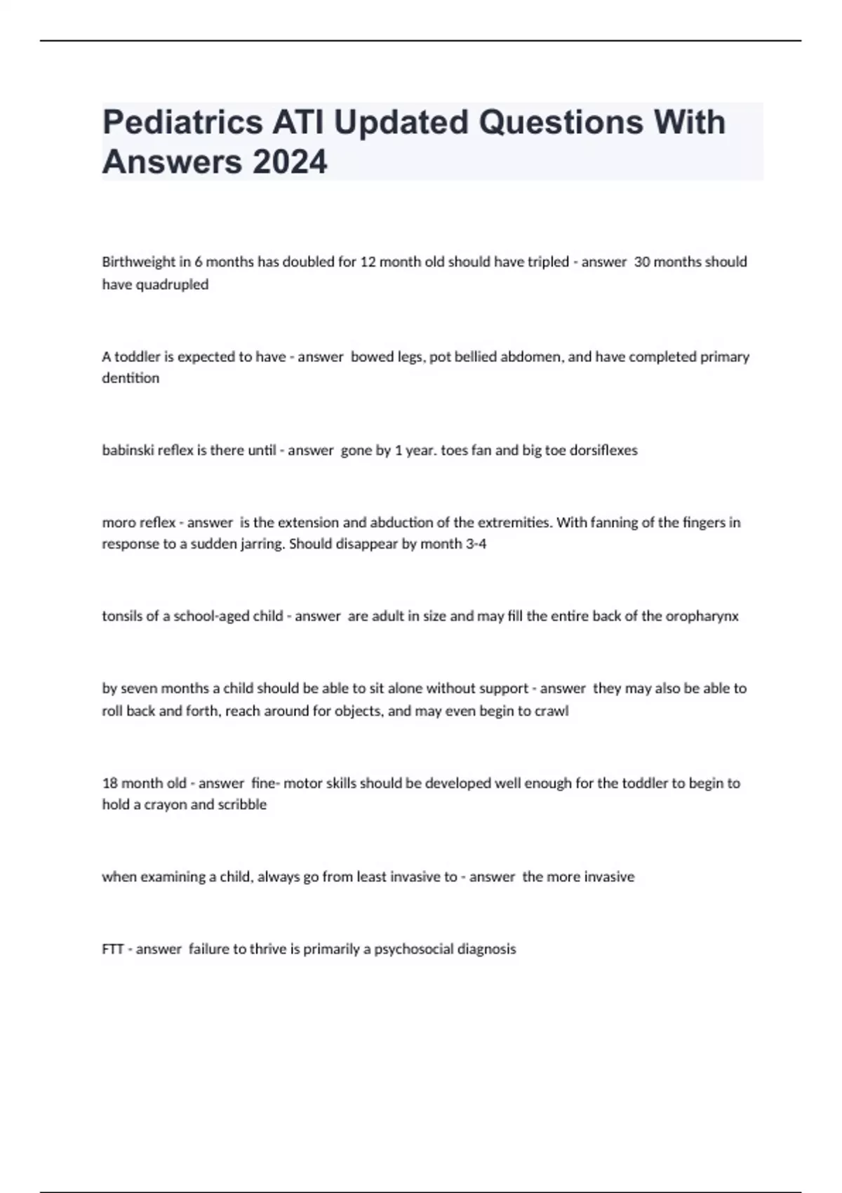 Pediatrics ATI Updated Questions With Answers 2024 Birthweight in 6 months has doubled for 12 month old should have tripled 30 months should have quadrupled A toddler is expected to have bowed legs, pot bellied abdomen, and have completed primary dentition babinski reflex is there until gone by 1 year. toes fan and big toe dorsiflexes moro reflex is the extension and abduction of the extremities. With fanning of the fingers in response to a sudden jarring. Should disappear by month 3-4