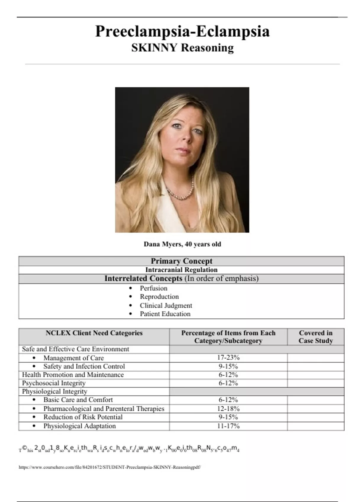 Preeclampsia-Eclampsia SKINNY Reasoning Dana Myers, 40 years old Primary Concept Intracranial Regulation Interrelated Concepts (In order of emphasis) • Perfusion • Reproduction • Clinical Judgment • Patient Education NCLEX Client Need Categories Percentage of Items from Each Category/Subcategory Covered in Case Study Safe and Effective Care Environment • Management of Care 17-23% • Safety and Infection Control 9-15% Health Promotion and Maintenance 6-12% Psychosocial Integrity 6-12% Physiological Integrity • Basic Care and Comfort 6-12% • Pharmacological and Parenteral Therapies 12-18% • Reduction of Risk Potential 9-15% • Physiological Adaptation 11-17% SKINNY Reasoning Part I: Recognizing RELEVANT Clinical Data History of Present Problem: Dana Myers is a 40-year-old woman, G-3 P-2 who is 34 weeks gestation. Her health care provider has been monitoring her weekly because her blood pressure has been increasing the past month and is currently 146/88. Last week she had 1+ non-pitting edema of both lower extremities (BLE) and her urine was negative for protein. Today during her clinic visit, Dana’s BP was 168/90. She had 2+ proteinuria and 3+ pitting edema BLE. She also complained of a mild headache in the center of her forehead, and seeing “spots.” Fetal heart tones via Doppler are 136/minute in the lower left quadrant. Abdominal measurement from pubic bone to top of fundus is 31 cm. The primary care provider was concerned and Dana has been admitted to the community hospital labor and delivery unit to be evaluated for severe preeclampsia. You are the admitting nurse responsible for her care. Personal/Social History: Dana has two children, ages two and four. She is married and both she and her husband are excited to have another baby, but have been concerned about this pregnancy. Dana’s previous two pregnancies were healthy, without incident, resulting in the vaginal births of a boy, then a girl. Dana’s parents live in the same town and are supportive. Dana works part-time teaching English at the local community college. Her husband is an engineer who works full time and is occasionally out of town for work. Dana is generally healthy, without any chronic illnesses. She does not smoke or use recreational drugs. She reports drinking socially but refrains while pregnant. What data from the histories are RELEVANT and has clinical significance to the nurse? RELEVANT Data from Present Problem: Clinical Significance: RELEVANT Data from Social History: Clinical Significance: Patient Care Begins: Current VS: P-Q-R-S-T Pain Assessment (5th VS): T: 98.4 F/36.9 C (oral) Provoking/Palliative: None P: 84 (regular) Quality: Stabbing/throbbing R: 20 (regular) Region/Radiation: Eyes, forehead BP: 164/98 Severity: 5/10 O2 sat: 95% room air Timing: Constant, unrelieved by acetaminophen What VS data are RELEVANT and must be recognized as clinically significant by the nurse? RELEVANT VS Data: Clinical Significance: