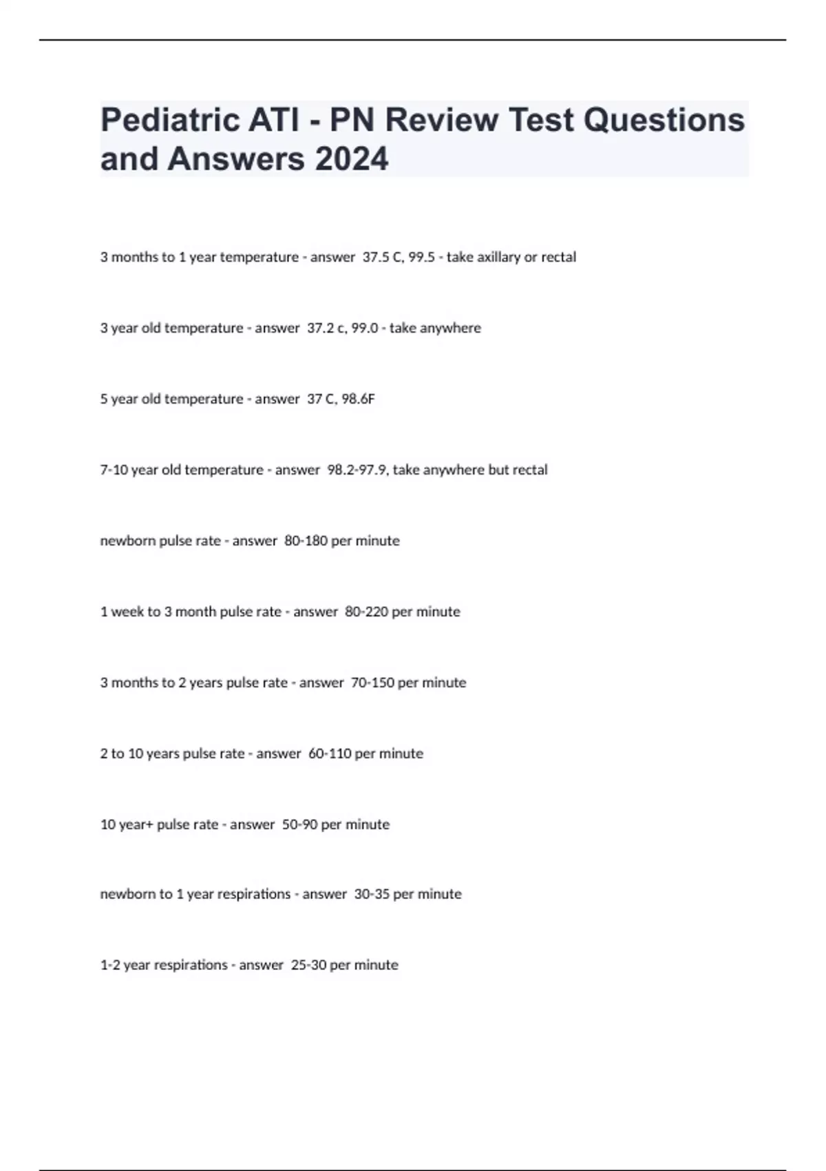 Pediatric ATI - PN Review Test Questions and Answers 2024 3 months to 1 year temperature 37.5 C, 99.5 - take axillary or rectal 3 year old temperature 37.2 c, 99.0 - take anywhere 5 year old temperature 37 C, 98.6F 7-10 year old temperature 98.2-97.9, take anywhere but rectal newborn pulse rate 80-180 per minute 1 week to 3 month pulse rate 80-220 per minute