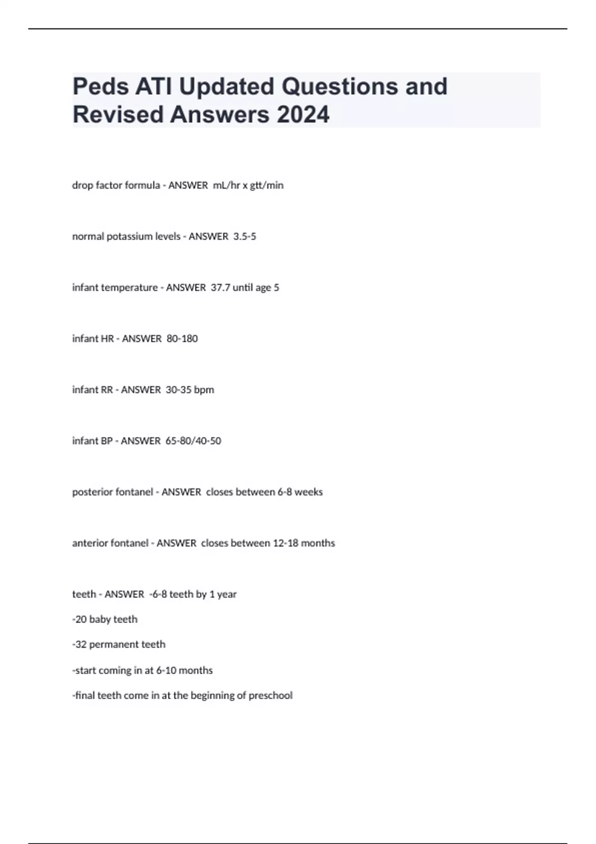 Peds ATI Updated Questions and Revised Answers 2024 drop factor formula mL/hr x gtt/min normal potassium levels 3.5-5 infant temperature 37.7 until age 5 infant HR 80-180 infant RR 30-35 bpm