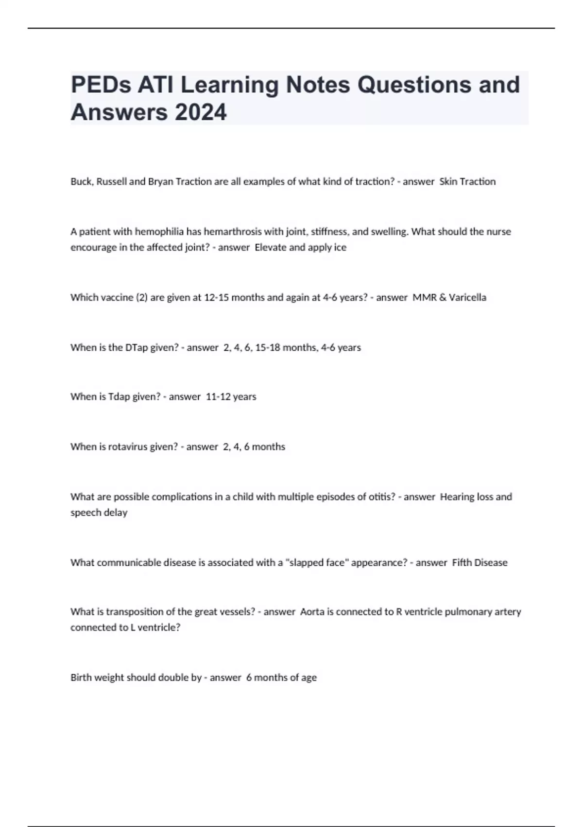 PEDs ATI Learning Notes Questions and Answers 2024 Buck, Russell and Bryan Traction are all examples of what kind of traction? Skin Traction A patient with hemophilia has hemarthrosis with joint, stiffness, and swelling. What should the nurse encourage in the affected joint? Elevate and apply ice Which vaccine (2) are given at 12-15 months and again at 4-6 years? MMR & Varicella When is the DTap given? 2, 4, 6, 15-18 months, 4-6 years