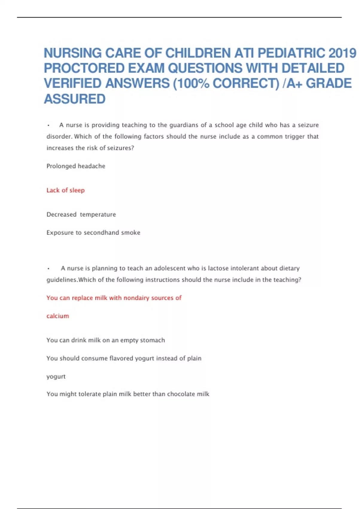 NURSING CARE OF CHILDREN ATI PEDIATRIC 2019 PROCTORED EXAM QUESTIONS WITH DETAILED VERIFIED ANSWERS (100% CORRECT) A+ GRADE ASSURED