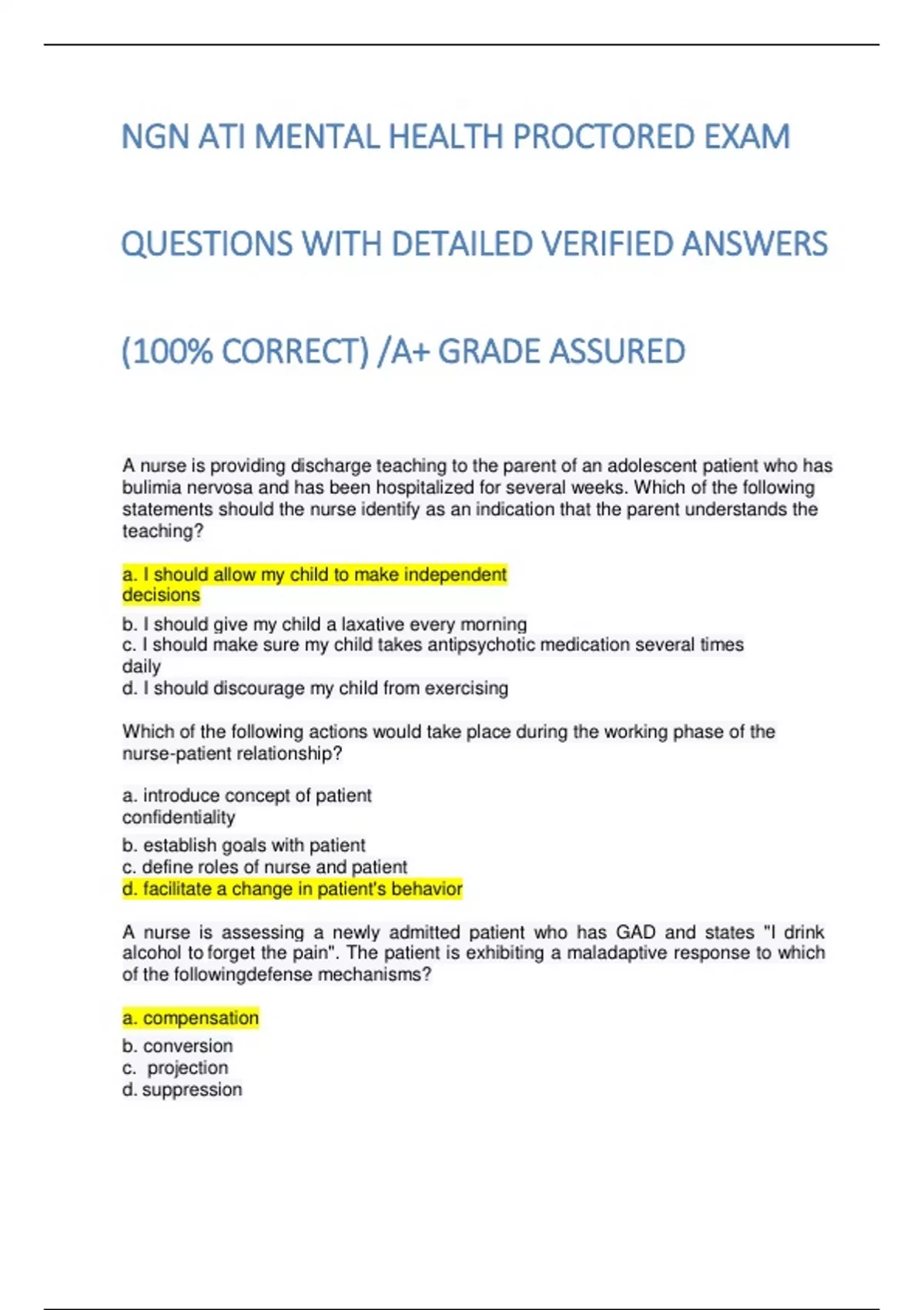 NGN ATI MENTAL HEALTH PROCTORED EXAM QUESTIONS WITH DETAILED VERIFIED ANSWERS (100% CORRECT) A+ GRADE ASSURED
