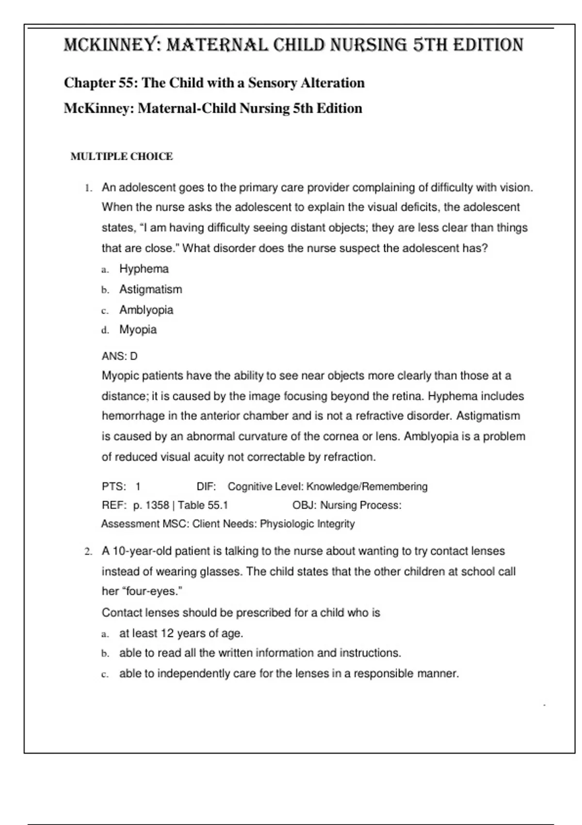 Maternal Child Nursing 5th Edition by McKinney- ISBN- 978-0323401708 TEST BANK Chapter 55: The Child with a Sensory Alteration Verified 2024 Practice Questions and 100% Correct Answers with Explanations for Exam Preparation, Graded A+ 1. An adolescent goes to the primary care provider complaining of difficulty with vision. When the nurse asks the adolescent to explain the visual deficits, the adolescent states, “I am having difficulty seeing distant objects; they are less clear than things that are close.” What disorder does the nurse suspect the adolescent has? a. Hyphema b. Astigmatism c. Amblyopia d. Myopia ANS: D Myopic patients have the ability to see near objects more clearly than those at a distance; it is caused by the image focusing beyond the retina. Hyphema includes hemorrhage in the anterior chamber and is not a refractive disorder. Astigmatism is caused by an abnormal curvature of the cornea or lens. Amblyopia is a problem of reduced visual acuity not correctable by refraction. PTS: 1 DIF: Cognitive Level: Knowledge/Remembering REF: p. 1358 | Table 55.1 OBJ: Nursing Process: Assessment MSC: Client Needs: Physiologic Integrity 2. A 10-year-old patient is talking to the nurse about wanting to try contact lenses instead of wearing glasses. The child states that the other children at school call her “four-eyes.” Contact lenses should be prescribed for a child who is a. at least 12 years of age. b. able to read all the written information and instructions. c. able to independently care for the lenses in a responsible manner. . d. confident that she really wants contact lenses. ANS: C The child must be able to care for the lenses independently. Serious eye damage can occur with irresponsible use of contact lenses. Chronologic age is not the major determinant. A responsible 10-year-old child might be permitted to wear contact lenses. The ability to read does not indicate understanding of the instructions. Confidence and “wanting” do not equal responsibility. PTS: 1 DIF: Cognitive Level: Knowledge/Remembering REF: p. 1358 OBJ: Nursing Process: Assessment MSC: Client Needs: Physiologic Integrity