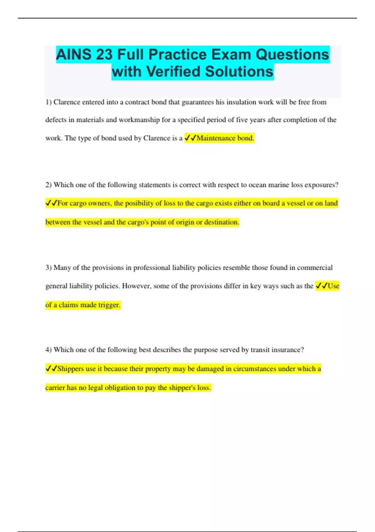 AINS 23 Full Practice Exam Questions with Verified Solutions 1) Clarence entered into a contract bond that guarantees his insulation work will be free from defects in materials and workmanship for a specified period of five years after completion of the work. The type of bond used by Clarence is a Maintenance bond. 2) Which one of the following statements is correct with respect to ocean marine loss exposures? For cargo owners, the posibility of loss to the cargo exists either on board a vessel or on land between the vessel and the cargo's point of origin or destination. 3) Many of the provisions in professional liability policies resemble those found in commercial general liability policies. However, some of the provisions differ in key ways such as the Use of a claims made trigger. 4) Which one of the following best describes the purpose served by transit insurance? Shippers use it because their property may be damaged in circumstances under which a carrier has no legal obligation to pay the shipper's loss. 5) If the Replacement Cost optional coverage of the Building and Personal Property Coverage Form (BPP) is selected, tenants' improvements and betterments areValued at replacement cost if the tenant actually repairs or replaces them, at its own cost, as soon as reasonably possible after the loss. 6) Smith Electricians has a Commercial General Liability (CGL) Coverage Form with the following limits: - $500,000 general aggregate - $500,000 products-completed operations aggregate - $250,000 personal and advertising injury - $250,000 each occurrence - $100,000 damage to premises rented to you - $10,000 medical expense While installing new wiring at a building under construction, Smith Electricians accidentally starts a fire that causes $400,000 damage to the building, but not to the wiring it was installing. How much will Smith's CGL insurer pay? $250,000 7) An environmental insurance policy that covers the loss exposures of a contractor performing environmental remediation services on contaminated sites is a(n) Contractors pollution liability policy 8) The Causes of Loss-Special Form provides coverage for which one of the following scenarios? The melting of ice, sleet, or snow on the building or structure. 9) Which one of the following is the coinsurance basis under a Business Income Coverage Form (BIC)? The projected net income and all operating expenses except for certain deductible items. 10) The condition of the Building and Person Property Coverage Form (BPP) that establishes a method for the insurer and the insured to resolve disputes about the insured property's value or amount of loss is referred to as the Appraisal condition. 11) Which one of the following Commercial Crime Coverage Form insuring agreements provides coverage on a full worldwide