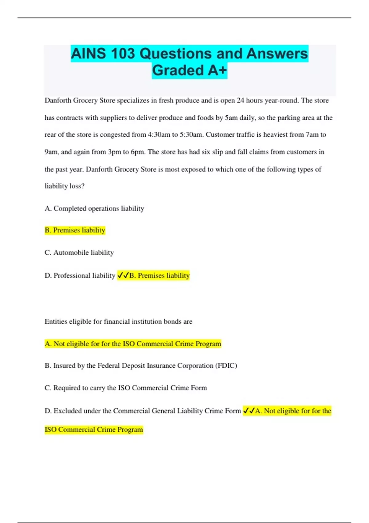 AINS 103 Questions and Answers Graded A+ Danforth Grocery Store specializes in fresh produce and is open 24 hours year-round. The store has contracts with suppliers to deliver produce and foods by 5am daily, so the parking area at the rear of the store is congested from 4:30am to 5:30am. Customer traffic is heaviest from 7am to 9am, and again from 3pm to 6pm. The store has had six slip and fall claims from customers in the past year. Danforth Grocery Store is most exposed to which one of the following types of liability loss? A. Completed operations liability B. Premises liability C. Automobile liability D. Professional liability B. Premises liability Entities eligible for financial institution bonds are A. Not eligible for for the ISO Commercial Crime Program B. Insured by the Federal Deposit Insurance Corporation (FDIC) C. Required to carry the ISO Commercial Crime Form D. Excluded under the Commercial General Liability Crime Form A. Not eligible for for the ISO Commercial Crime Program Smith Stores had net income of $5,000 per month in the 12 months before a covered business income loss. The store is unable to reopen for three months. During that time, continuing expenses totaled $6,000. What is the amount of Smith Stores' business income loss? A. $6,000 B. $15,000 C. $21,000 D. $66,000 C. $21,000 The business was interrupted for three months, for a business income loss of $15,000, plus continuing expenses of $6,000. The Malvern Company is a small business insured under a BOP for both building and BPP. Which one of the following would be covered under the definition of a building under the company's BOP? A. Product manufactured by Malvern Company B. The land that the building sits on C. Air conditioning equipment attached to the building D. The fence that surrounds the building C. Air conditioning equipment attached to the building The Workers Compensation and Employers Liability Insurance Policy provides that the insured is responsible to reimburse the insurer to which one of the following situations? A. Any benefits paid by the insurer even though the insured has failed to comply with policy conditions B. Benefits paid to employees with pre-existing injuries C. Penalties levied under a workers compensation law against the insured for noncompliance with health and safety laws and regulations D. A liability suit was filed against the insured for occupational injuries to employees C. Penalties levied under a workers compensation
