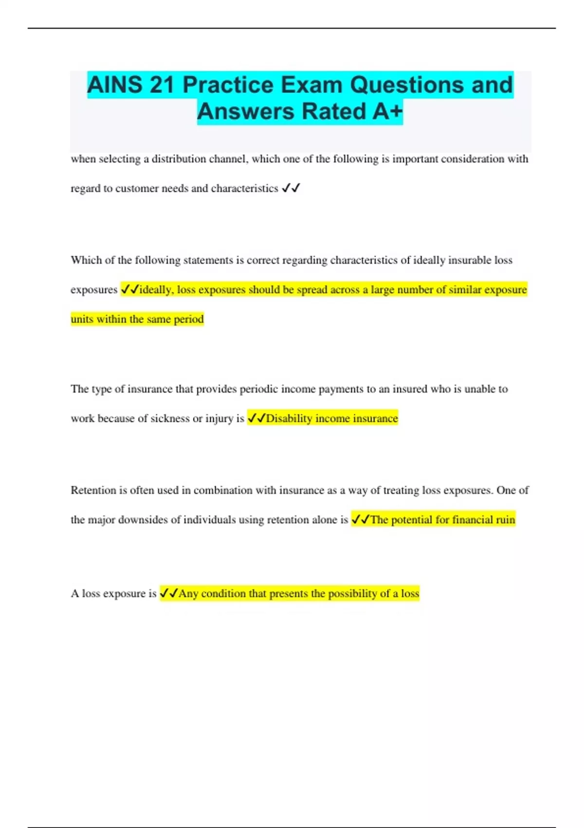 AINS 21 Practice Exam Questions and Answers Rated A+ when selecting a distribution channel, which one of the following is important consideration with regard to customer needs and characteristics Which of the following statements is correct regarding characteristics of ideally insurable loss exposures ideally, loss exposures should be spread across a large number of similar exposure units within the same period The type of insurance that provides periodic income payments to an insured who is unable to work because of sickness or injury is Disability income insurance Retention is often used in combination with insurance as a way of treating loss exposures. One of the major downsides of individuals using retention alone is The potential for financial ruin A loss exposure is Any condition that presents the possibility of a loss Liability coverage for loss exposures arising from a business organizations premises and operations, its products, or its completed work is typically provided by Commercial general liability insurance Though premiums are an obvious cost of insurance, many insureds believe that are too high because Benefits are intangible until loss occurs Insurance is not the only risk management transfer technique. When circumstances are appropriate, transfer can be accomplished through noninsurance transfer technique Which one of the following is an example of a fortuitous loss An unknown vandal spray- paints graffiti on the insured's garage Which one of the following statements is correct regarding the benefits that insurance provides Investment income helps keep insurance premiums at a reasonable level Claim buildup is considered to be among which one of the following costs of insurance increased losses The primary role of insurance is to indemnify individuals and organizations for covered losses Coverage for money, securities, and other property from various causes of loss such as burglary, robbery, theft, and employee dishonesty typically is provided by commercial crime insurance Which of the following is an opportunity cost of insurance An insureds funds that could be invested elsewhere if purchasing insurance were not necessary Coverage for miscellaneous types of property such as movable property, goods in domestic transit, and property use in transportation and communication, typically is provided by inland marine insurance For insurers to utilize pooling most effectively and prevent catastrophic losses, the insured exposure units need to be independent